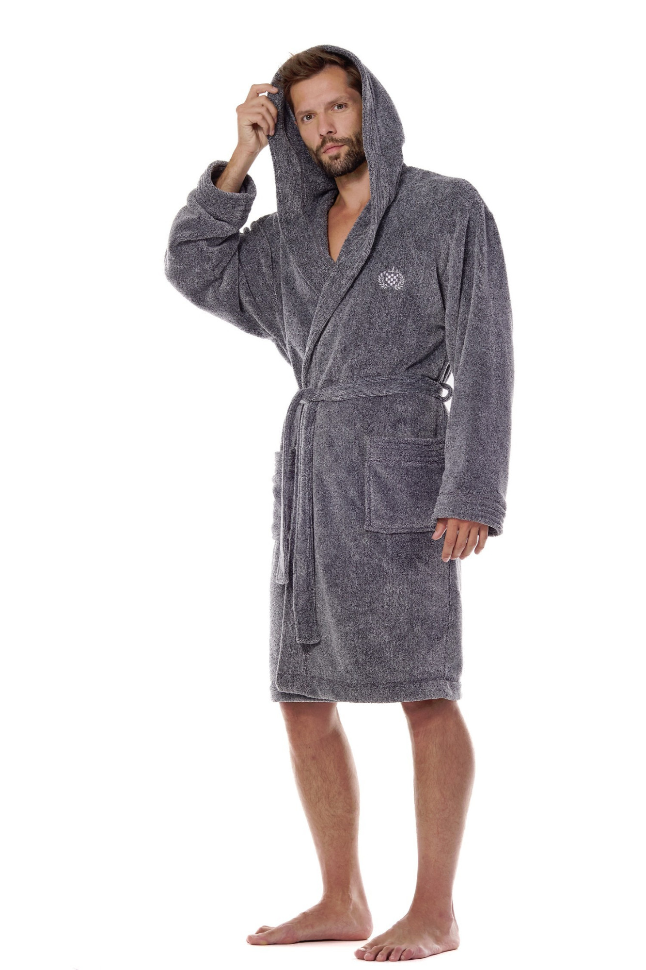 Pánsky župan s kapucňou - mäkká a pohodlná pletenina - ozdobná výšivka na hrudi - zaväzovanie v páse - pohodlné vrecká na bokoch Zloženie: 100 % polyester