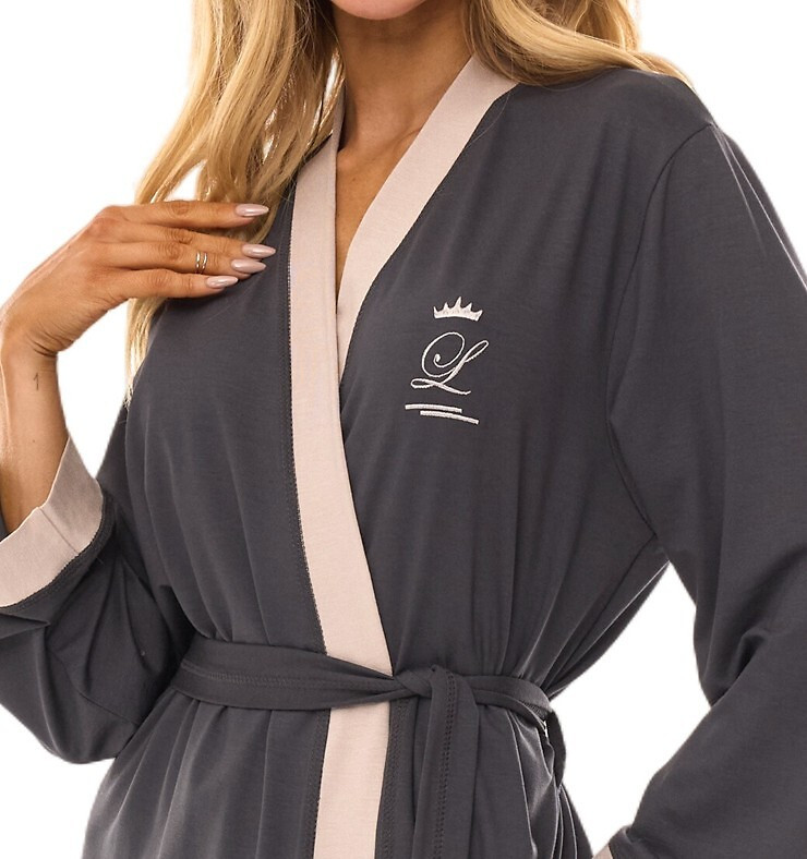 Dámsky dlhý župan - vysokokvalitný jemný viskózový úplet - manžety a klopy s kontrastným farebným lemovaním - jemná výšivka na hrudi - dlhé rukávy - zaväzovanie v páse - pohodlné vrecká na bokoch - dĺžka pod kolená Zloženie: 100 % viskóza