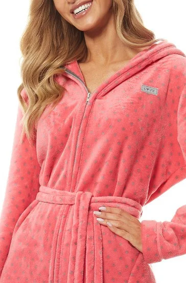Pohodlný dámsky župan - z mäkkého bodkovaného úpletu - s kapucňou - zapínanie na zips - jemná aplikácia na hrudi - zaväzovanie v páse - bočné vrecká Zloženie: 100 % polyester