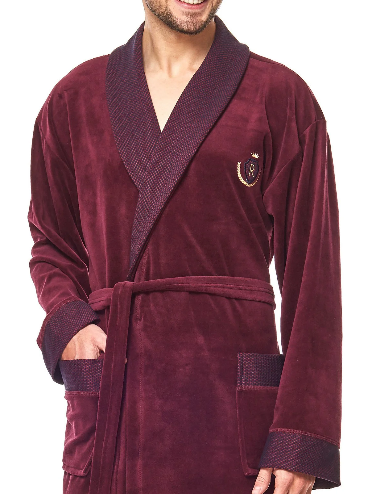 Pánsky velúrový župan - krátke, so šálovým golierom, zaväzované v páse - dve vrecká na úrovni bokov - manžety, golier a vrecká zo vzorovaného úpletu alebo hladkého velúru - malá aplikácia na úrovni hrudníka Zloženie: 80% bavlna, 20% polyester