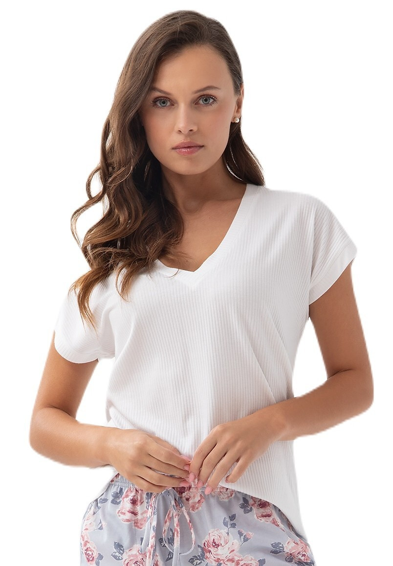 Dámske pyžamo - vyrobené z kvalitnej bavlny - pruhované tričko s krátkym rukávom - výstrih do V - nohavice s kvetinovou potlačou - dĺžka nohavíc 7/8 - elastický pás s pleteným lemom - pohodlné vrecká na bokoch Zloženie: tričko 93 % bavlna, 7 % lycra; nohavice 100 % bavlna