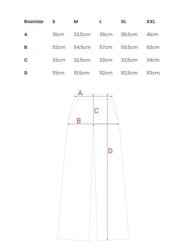 95% polyester 5% elastan MATERIÁL Materiál: ľahká štruktúrovaná tkanina (krep), matný povrch PODROBNOSTI O VÝROBKU Pás: vysoký, elastický pás Zapínanie: navliekacie (bez zipsu) Vrecká: žiadne Model: M862 Navrhnuté a vyrobené v Poľsku Model na fotografii má 171 cm a nosí veľkosť S Strih a strih Strih: voľný Strih: široké nohavice Dĺžka: po celej dĺžkeVEĽKOSŤSMLXLXXLA31 cm33,5cm36cm38,5cm41cmB52cm54,5cm57cm59,5cm62cmC32cm32,5cm33cm33,5cm34cmD111cm111,5cm112cm112,5cm113cm