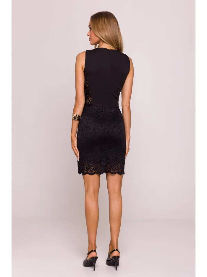 Čipka: 90% nylon 10% spandex Hlavná tkanina: 95% polyester 5% elastan MATERIÁL Materiál: hladká tkanina, čipkové vsadky na bokoch a spodnom leme PODROBNOSTI O PRODUKTE Výstrih: vysoký, okrúhly výstrih Rukávy: bez rukávov Zapínanie: skrytý zips na chrbte Vrecká: žiadne Model: M864 Navrhnuté a vyrobené v Poľsku Modelka na fotografii má 171 cm a nosí veľkosť S Strih a strih Strih: vypasovaný Tvar: ceruzková silueta s geometrickými čipkovanými panelmi, ktoré opticky tvarujú pás Dĺžka: nad kolenáVEĽKOSŤSMLXLA32 cm33 cm34cm35cmB42cm44,5cm47cm49,5cmC36cm38,5cm41cm43,5cmD45cm47,5cm50cm52,5cmE90cm91,5cm93cm94,5cm