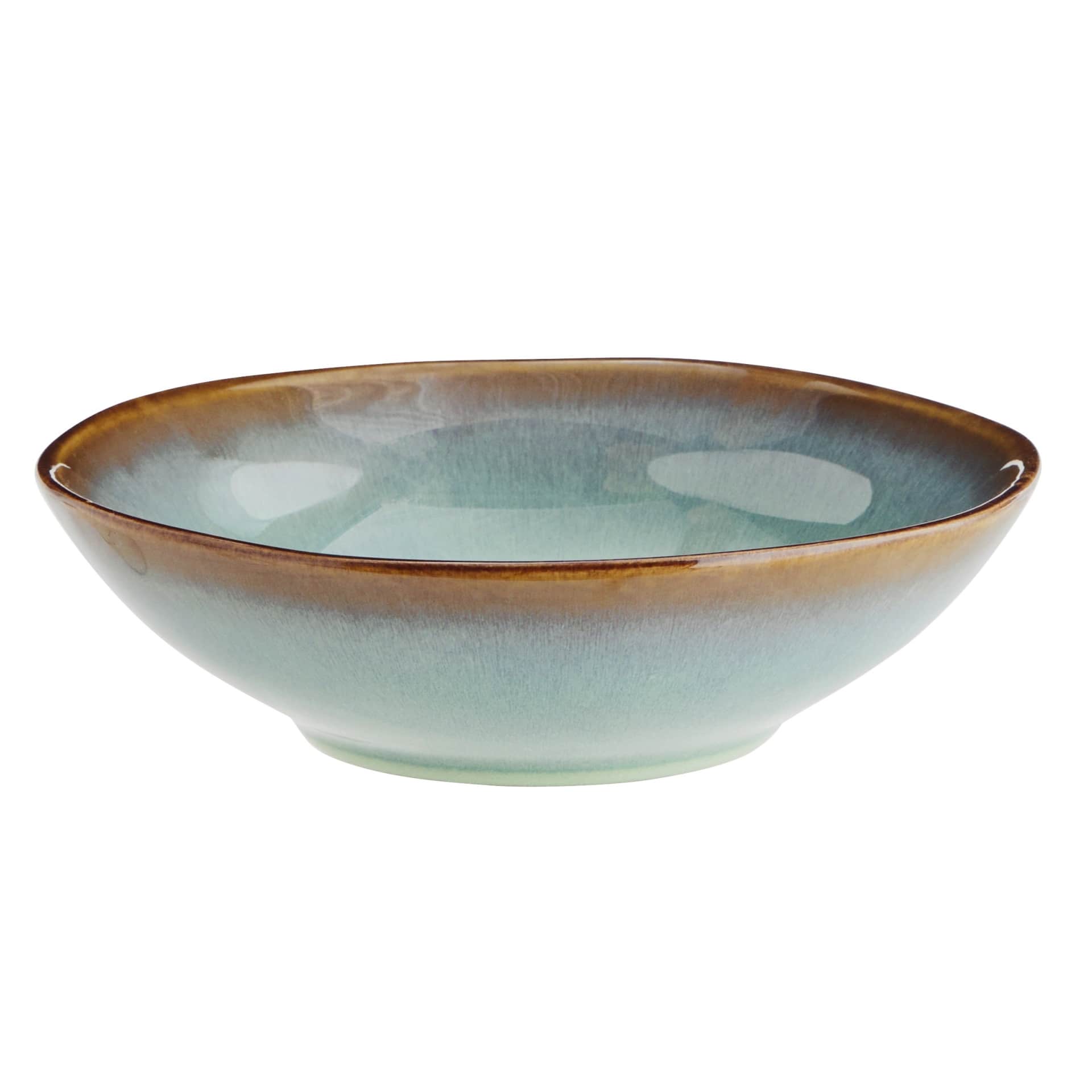 Nechajte sa uniesť krásou prírodných materiálov a jemnými farebnými prechodmi! Kameninová miska od Madam Stoltz v eukalyptovo zelenej farbe s hnedým okrajom vnesie do vašej kuchyne jedinečnú atmosféru škandinávskeho minimalizmu a harmónie.
