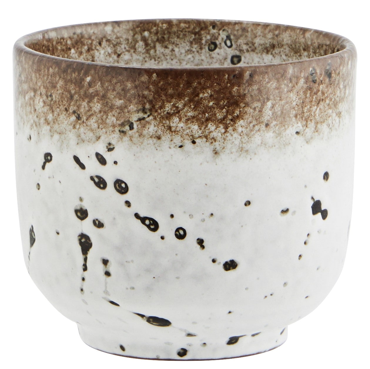 Šálka je kameninová, glazovaná na bielu farbu s hnedými fliačikmi a hnedým okrajom. Kus od kusu sa môže mierne líšiť, pretože každý kúsok je glazovaný ručne. objem 200 ml / priemer 8 cm / výška 7 cm Vyrobené z kameniny.