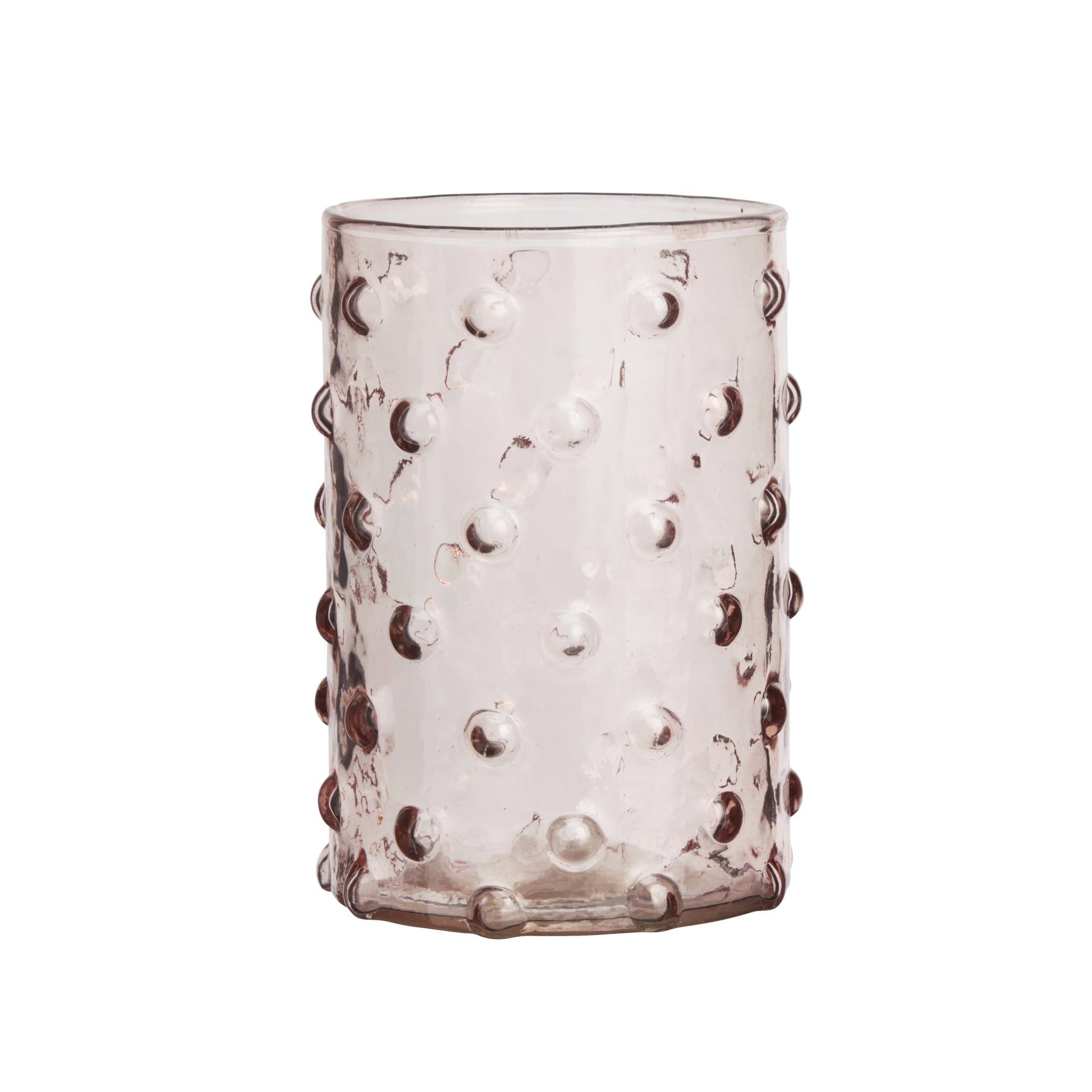 Tento pohár so vzorom plastických bodiek v jemnej broskyňovo ružovej farbe je vyrobený z čiastočne recyklovaného skla, ktoré je odolné, ľahké a šetrné k životnému prostrediu.