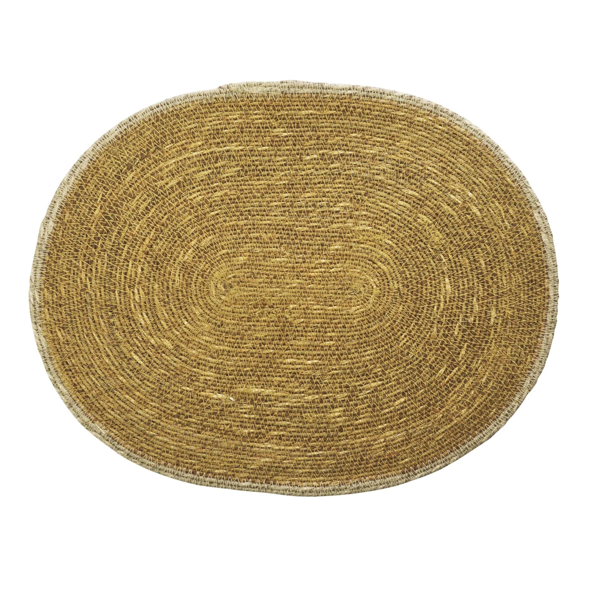 Je vyrobené z morskej trávy, ktorá bola ručne farbená a sušená na slnku a ručne tvarovaná do oválneho prestierania. Zemité farby pekne ladia s okrajom obšitým bavlnenou niťou v prírodnej farbe.