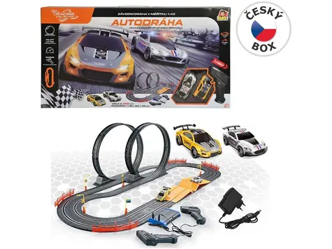MaDe 11193 - Autodráha 560 cm, dve autá, s EU adaptérom, 136 x 60 x 38 cm