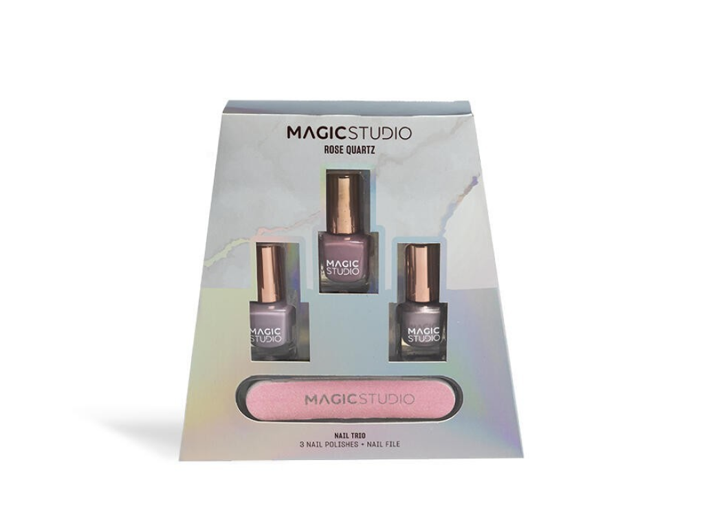 Vylepšite svoju zbierku lakov na nechty s kolekciou Nail Trio Set z radu Rose Quartz od Magic Studio. Táto sada obsahuje tri podmanivé laky na nechty v žiarivo ružovom, jemnom ružovom a staroružovom odtieni, ktoré vám zaručia elegantnú a dlhotrvajúcu manikúru. Súčasťou sady je aj pilník na nechty pre dokonalý tvar. S týmito vysoko pigmentovanými lakmi premeníte svoje nechty na symbol sofistikovanosti, či už pre seba alebo ako skvelý darček.