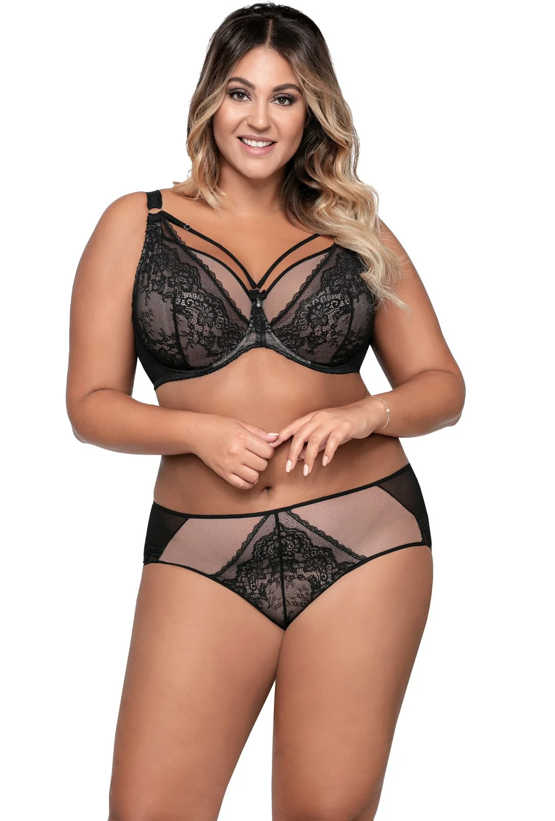 Mäkká dámska podprsenka s kosticami. Podprsenka je vyrobená zo dvojitej vrstvy látky. Vrchnú časť košíčkov tvorí béžový tyl a jemná čipka. Vrchná časť košíčkov je olemovaná hladkou pružnou páskou. Nad košíčkami je ozdoba v podobe jemných pásikov. Ramienka je možné nastaviť, ale nemožno ich odopnúť. Podprsenka má strih a konštrukciu typu 1154. Zloženie: 88% polyamid, 8% bavlna, 4% elastan.