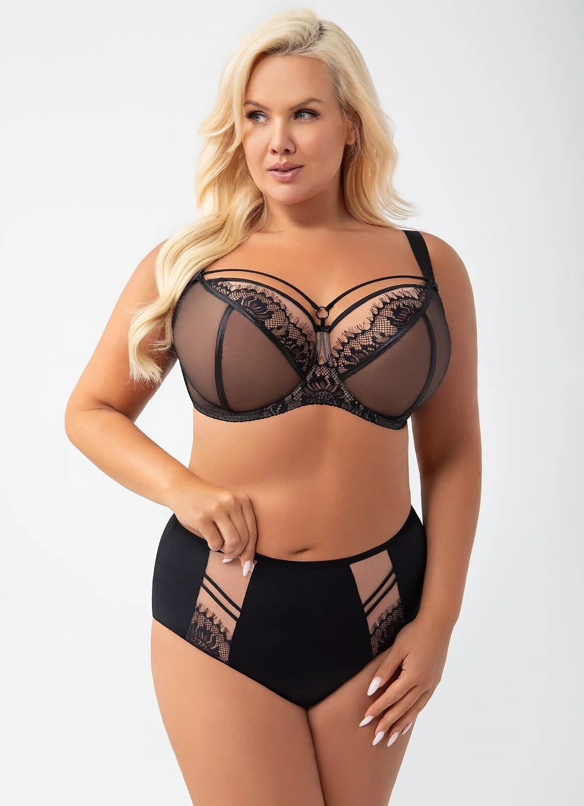 Mäkká dámska podprsenka s kosticami. Podprsenka je vyrobená zo dvojitej tylovej látky. Vrchnú časť košíčkov tvorí béžový tyl a jemná čipka. Model je olemovaný hladkou pružnou páskou. Nad košíčkami je ozdoba v tvare jemných pásikov. Ramienka je možné nastaviť, ale nemožno ich odopnúť. Zloženie: 90% polyamid, 7% elastan, 3% polyester.