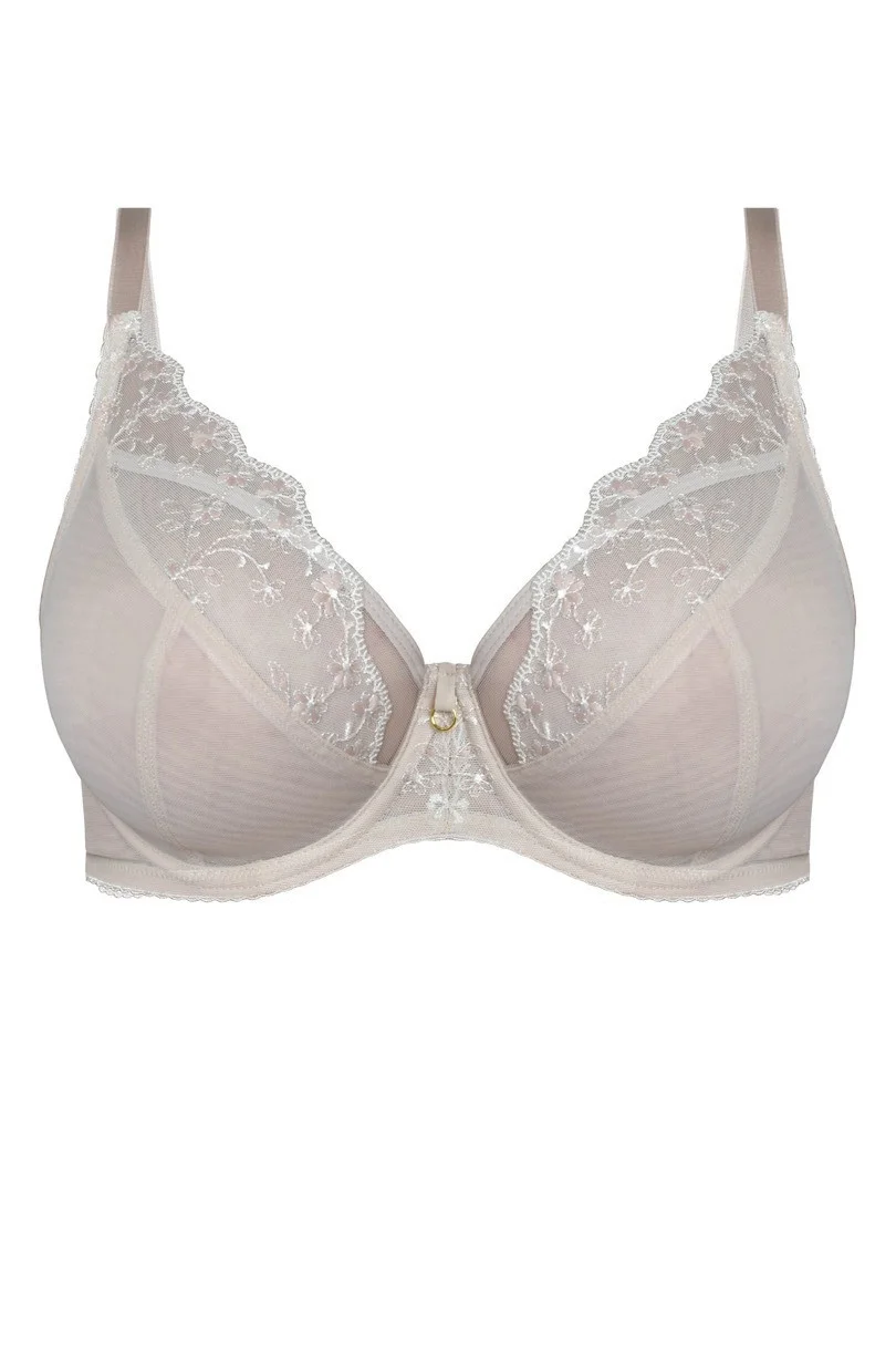 Mäkká podprsenka, košíčky z kvalitnej štruktúrovanej sieťoviny, na ktorej je našitá čipka s kvetinovým motívom. Jemné ako hmla, absolútny hit na leto pod ľahké blúzky pre dámy, ktoré sa nerady nudia v základnej bielizni! Dizajn ideálny pre stredné až veľké poprsie. Zloženie: 85% polyamid ,10% elastan, 5% polyester