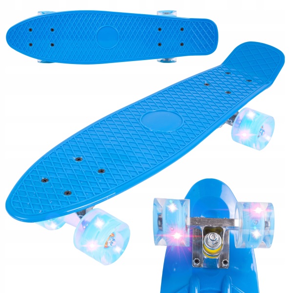 DETSKÝ SKATEBOARD LED KOLIESKA 100KG Kolieska: 60mm, vyrobená z PU s LED LIGHT Ložiská: ABEC7 Protišmykový povrch Rozmery dosky: 56 x 15 cm Tvrdosť koliesok: 82A PU (VLASTNOSTI GUMY)