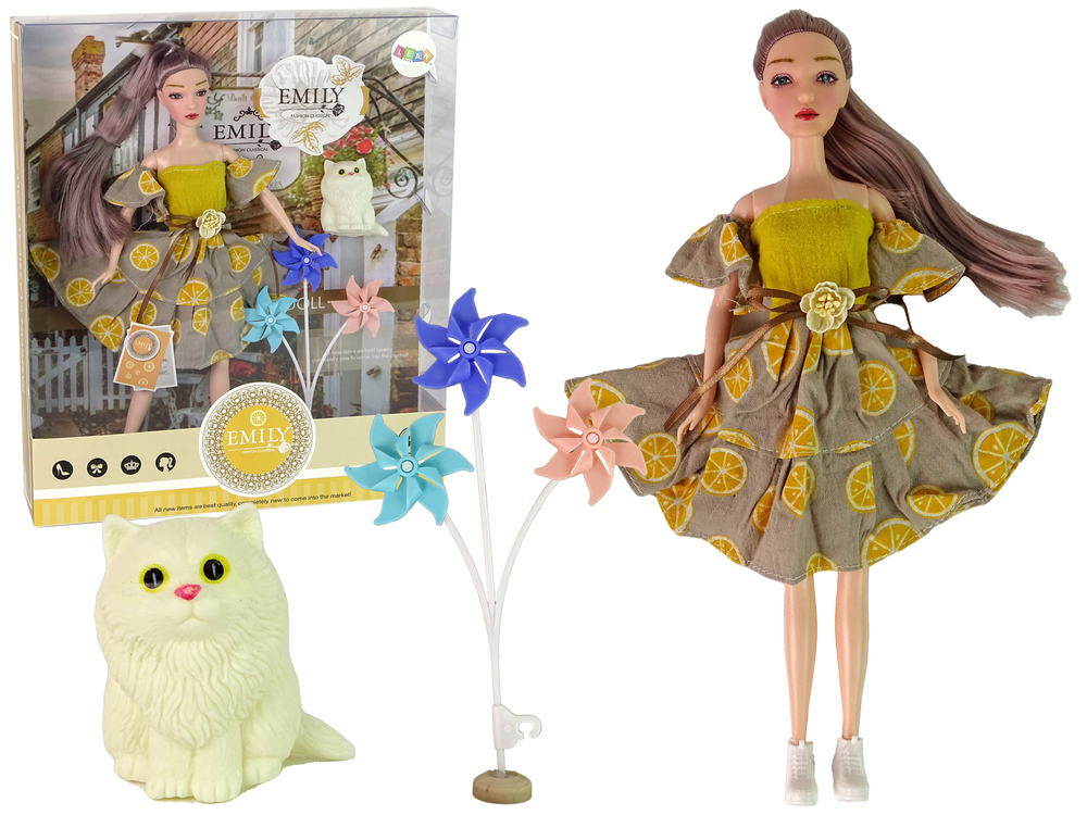 Predstavujeme bábiku Emily s vetráčikmi a roztomilým mačiatkom, ktoré umožnia vášmu dieťaťu rozvíjať svoju predstavivosť cez hranie s priloženými výrobkami. Postavička Emily má vzdušné krásne šaty s oranžovým vzorom, opasok s kvetinou a biele topánočky, ktoré jej dodávajú športový štýl a môže hýbať rukami, nohami aj hlavou. Bábika má krásne modré oči a dlhé vlasy. Mačiatko po stlačení vydáva zvukové efekty mňaukania.