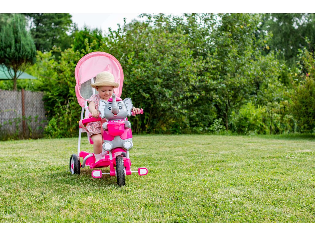 Detská trojkolka ponúka úložný priestor na hračky alebo občerstvenie pre dieťa. Na hlavičke slona si môže dieťa hrať s tlačidlami, ktoré vydávajú zvuky.