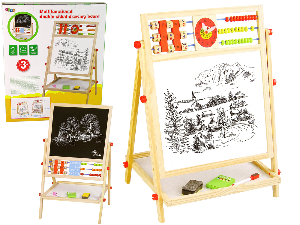Obojstranná Edukačná Tabuľa s Počítadlom, Hodinami a Abecedou je výnimočný nástroj pre rozvoj najmenších. Vyrobená z pevného dreva, zaručuje odolnosť a bezpečnosť počas hry. Vďaka svojej otočnej konštrukcii je možné využívať dve rôzne plochy: jednu pokrytú čiernym materiálom, ideálnu na kreslenie kriedou, a druhú, bielu, vhodnú na kreslenie fixy.