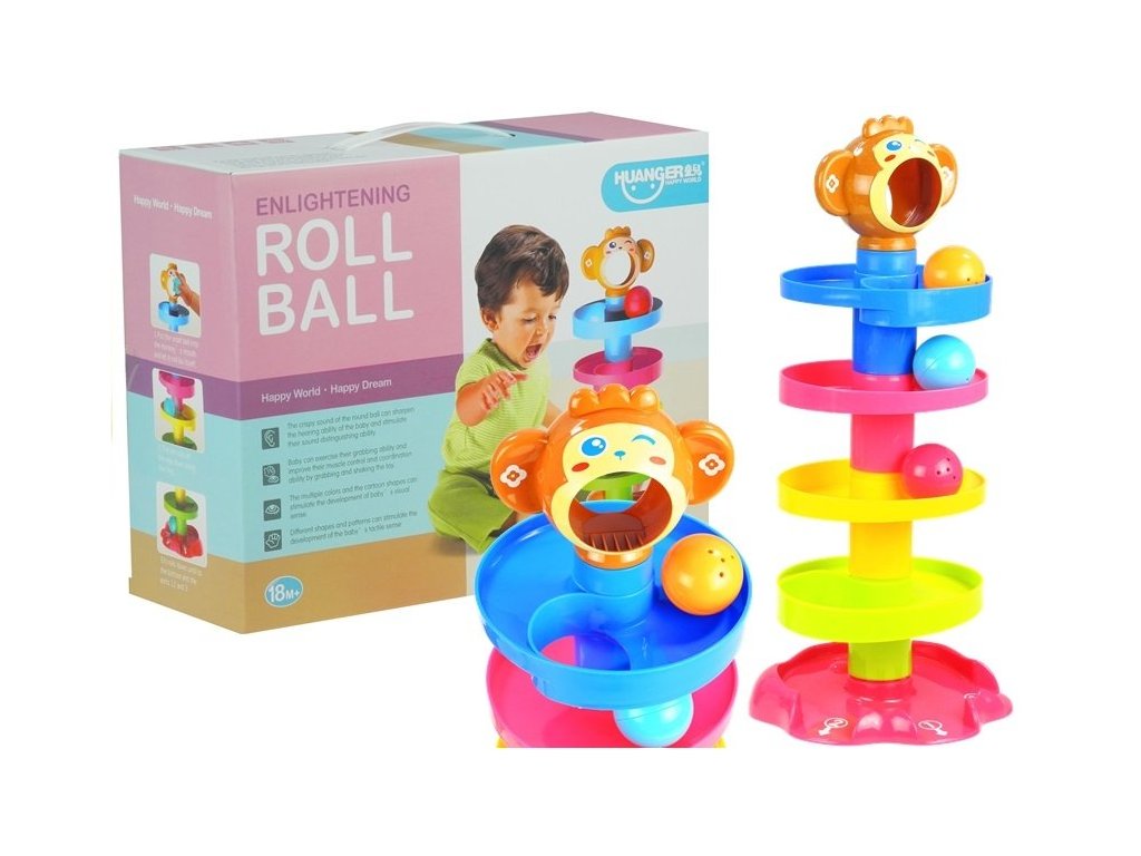 Vložte loptičky do otvoru, ktorý sa nachádza na tvári opičky. Následne musí loptičky prejsť všetkými poschodiami a dostať sa až dole. Loptičky majú vnútri hrkajúce prvky, ktoré stimulujú sluch dieťaťa.