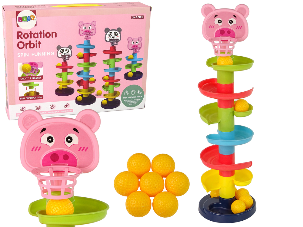 Šmykľavka sa skladá zo 6 farebných úrovní, ktoré musí gulička umiestnená dieťaťom prekonať. V hornej časti sa nachádza malé prasiatko s košíkom. Pri hre sa batoľa bude snažiť trafiť do košíka a zároveň si precvičí koordináciu, presnosť a manuálnu zručnosť.