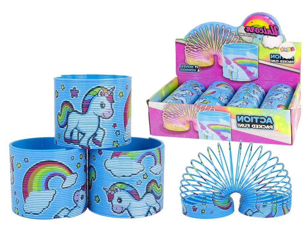 Predstavujeme kultovú modrú pružinku s roztomilým motívom jednorožca a dúhy, v kompaktnej veľkosti 6 cm .