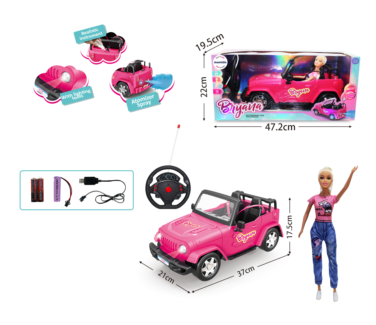Štýlový ružový kabriolet na diaľkové ovládanie poteší každú malú milovníčku bábik. Auto je dodávané spolu s bábikou Bryana, ktorá môže riadiť priamo zo sedadla vodiča. Vozidlo sa ovláda pomocou volantového diaľkového ovládača, zvláda jazdu vpred, vzad aj zatáčanie.