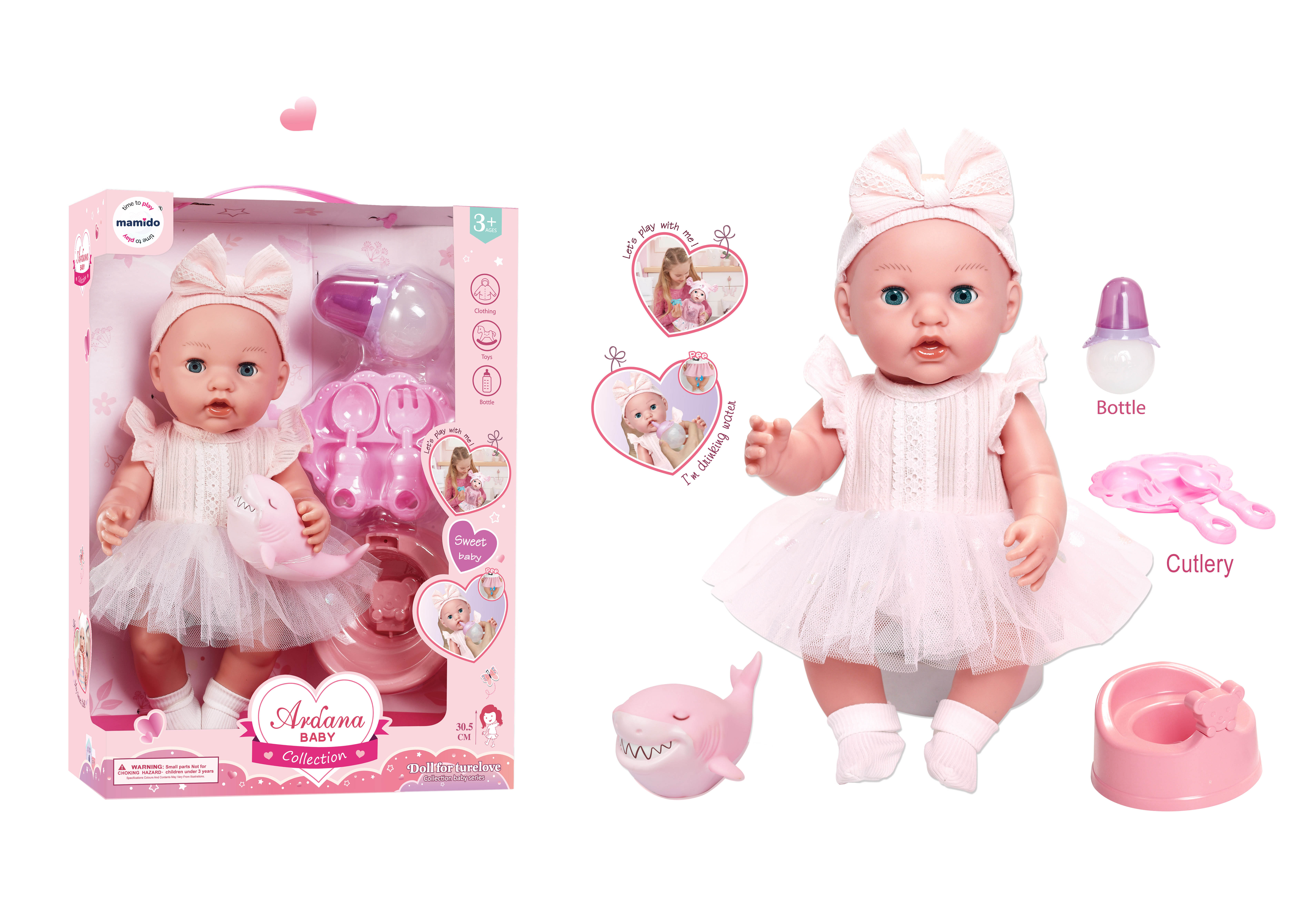 Bábätko v ružových šatôčkach prináša deťom svet nežnej starostlivosti, hier na rodinu a rozvíjanie predstavivosti. Bábika má jemné črty, mäkké telíčko a vďaka svojej veľkosti 30,5 cm sa skvele drží aj menším deťom. Súčasťou balenia je bohatá súprava doplnkov, ktorá umožní kŕmenie, prebaľovanie aj hranie – nechýba fľaštička, nočník, súprava príborov ani roztomilá hračka v tvare žraločeka.