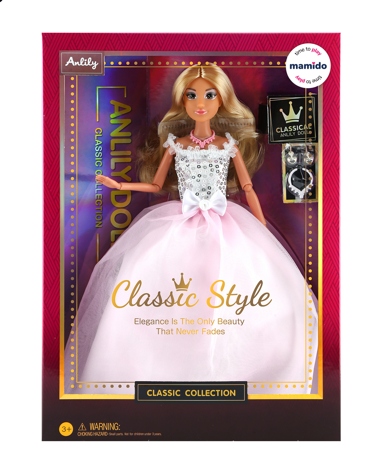 Elegantná bábika Anlily z edície Classic Style očarí všetky malé princezné svojimi nádhernými šatami v kombinácii bielej a ružovej farby. Hrudná časť je zdobená flitrami a mašľou, zatiaľ čo bohatá tylová sukňa pôsobí slávnostne a rozprávkovo. Bábika meria 29 cm (11,5 inch), má dlhé vlasy a pohyblivé končatiny.