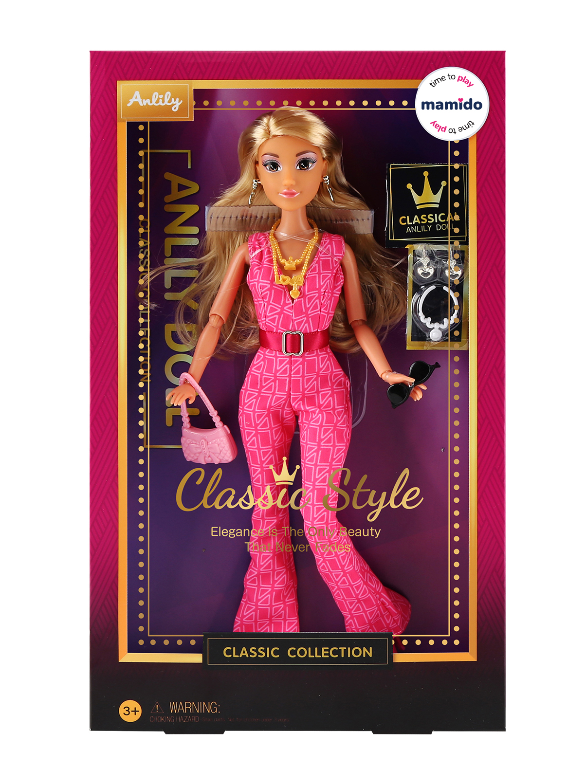 Objavte čaro elegancie s bábikou Anlily Classic Style vo veľkosti 29 cm. Bábika s hnedou pleťou je oblečená do moderného overalu s originálnym vzorom, opaskom a štýlovými doplnkami. Súčasťou balenia je kabelka a súprava šperkov, ktoré dodajú hre nádych luxusu a kreativity. Perfektná voľba pre malé milovníčky módy a zberateľky.