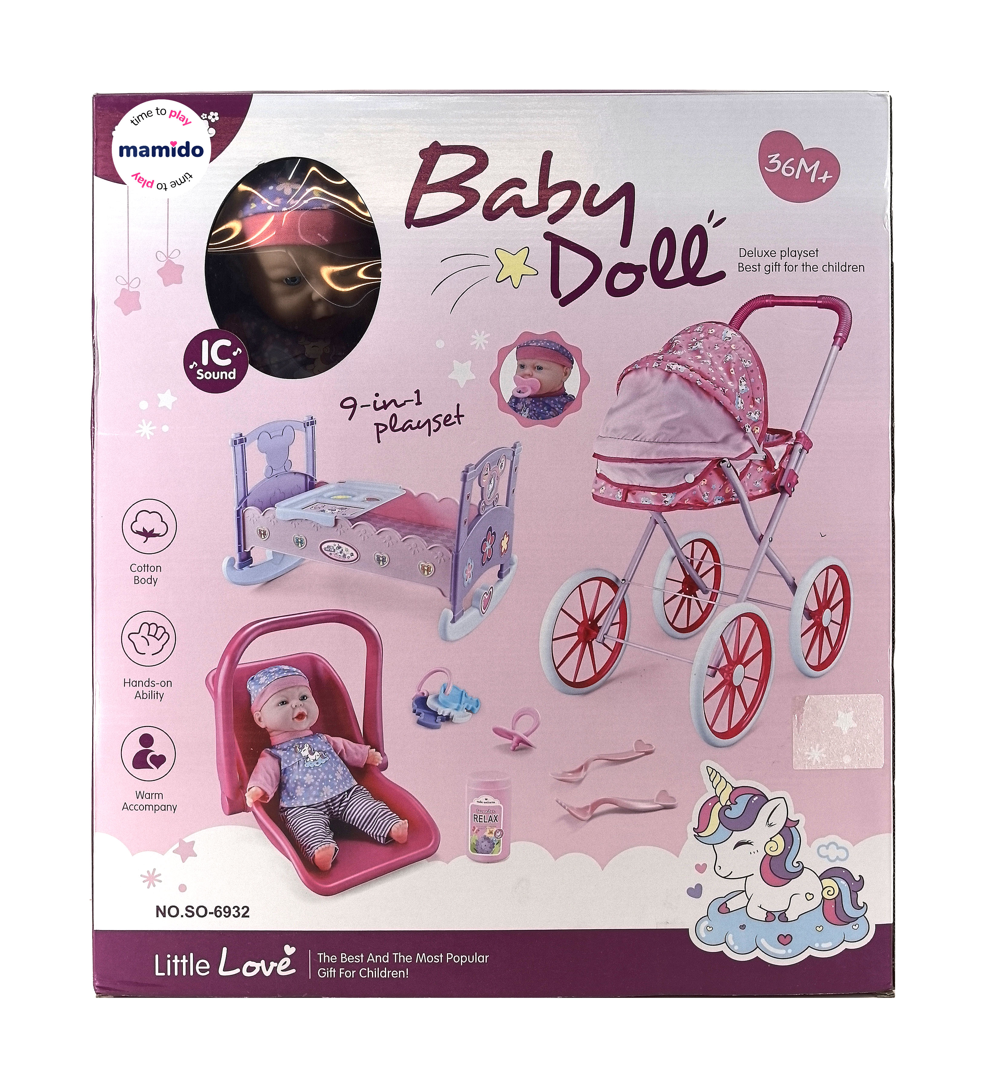 Veľká herná súprava pre malé mamičky – obsahuje bábiku, diely na zostavenie kočíka, postieľky, autosedačky a ďalšie doplnky. Dieťa si môže zostaviť rôzne varianty starostlivosti o bábätko, prevážať ho, uspať aj nosiť. Súčasťou sú aj samolepky na ozdobenie. Hračka je vhodná pre deti od 3 rokov.