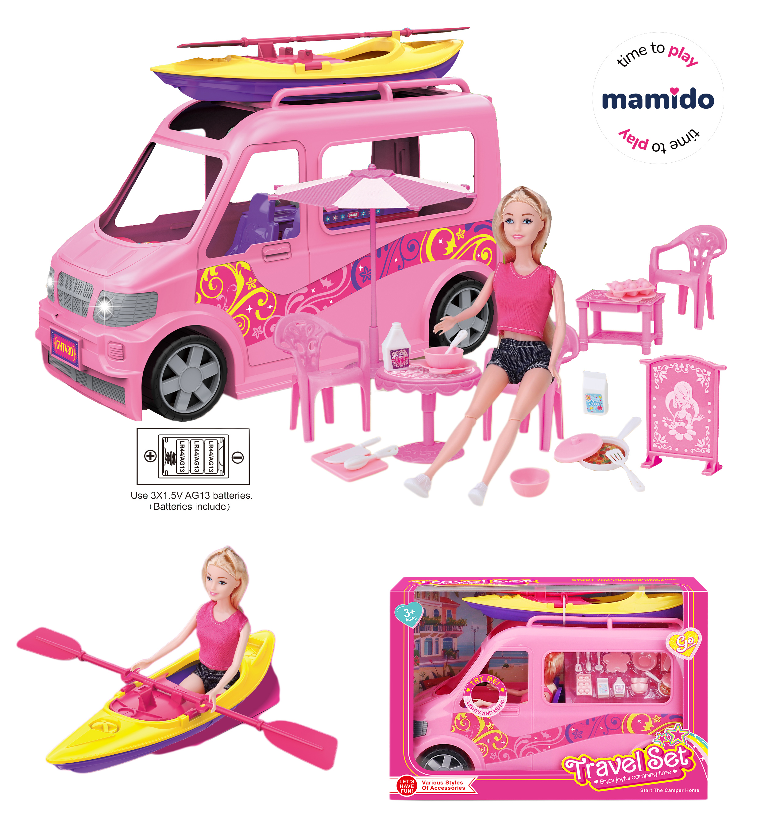 Uži si dokonalé dobrodružstvo s krásnou bábikou a jej ružovým obytným autom! Súprava ponúka všetko pre zábavné cestovanie – od kajaku na vodné radovánky až po posedenie s nábytkom a drobnými doplnkami. Obytný automobil navyše vydáva svetelné a hudobné efekty, čo robí hru ešte zábavnejšou a realistickejšou.