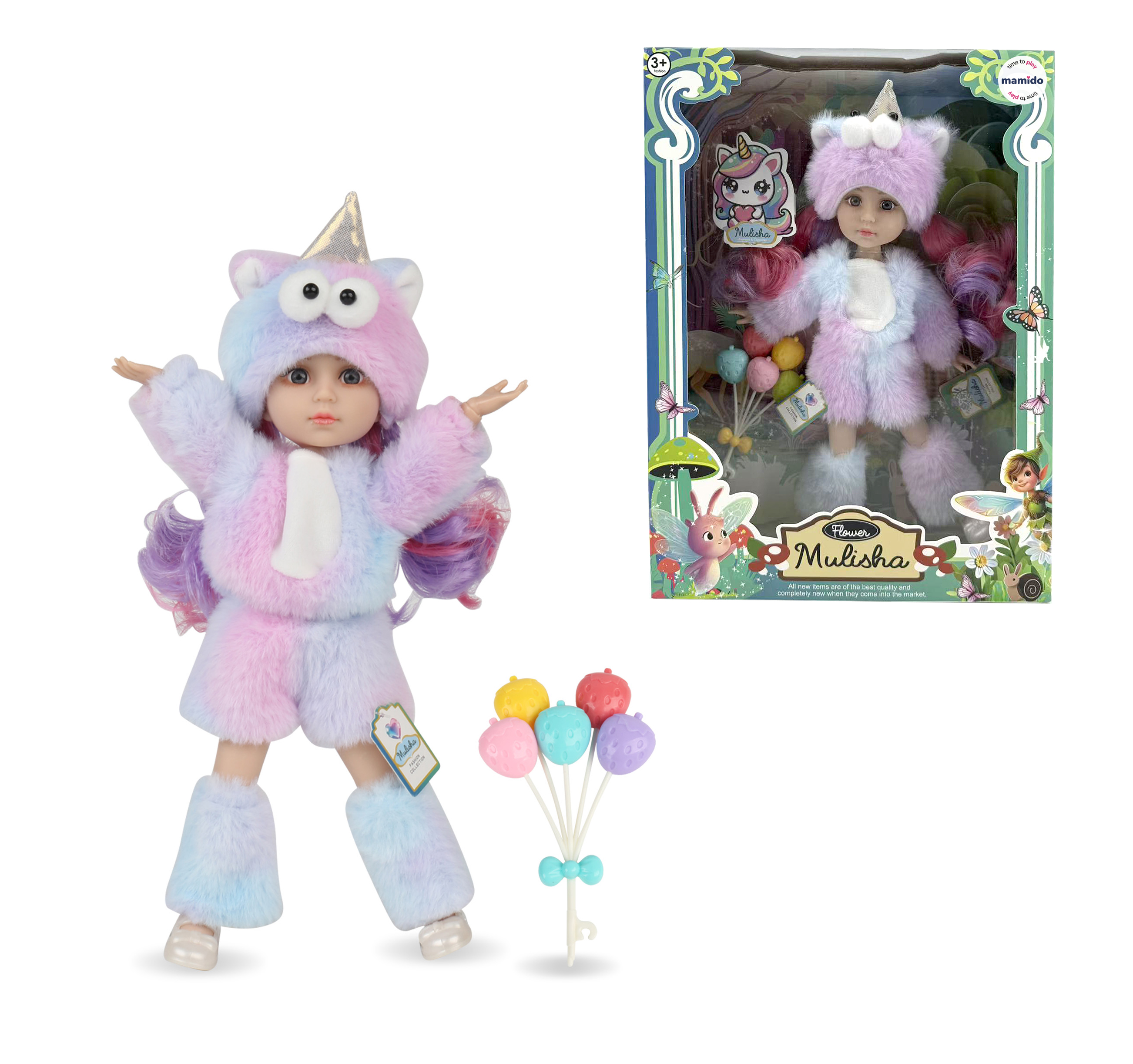 Farebná a roztomilá bábika Munlisha očarí každé dieťa svojim jedinečným vzhľadom a pohyblivým telom. Je oblečená do plyšového kostýmu jednorožca s farebnými vláskami v dúhových odtieňoch, ktoré lákajú na česanie a tvorenie účesov. Vďaka kĺbovému telu umožňuje bábika viac pohybov a prirodzené pózovanie.