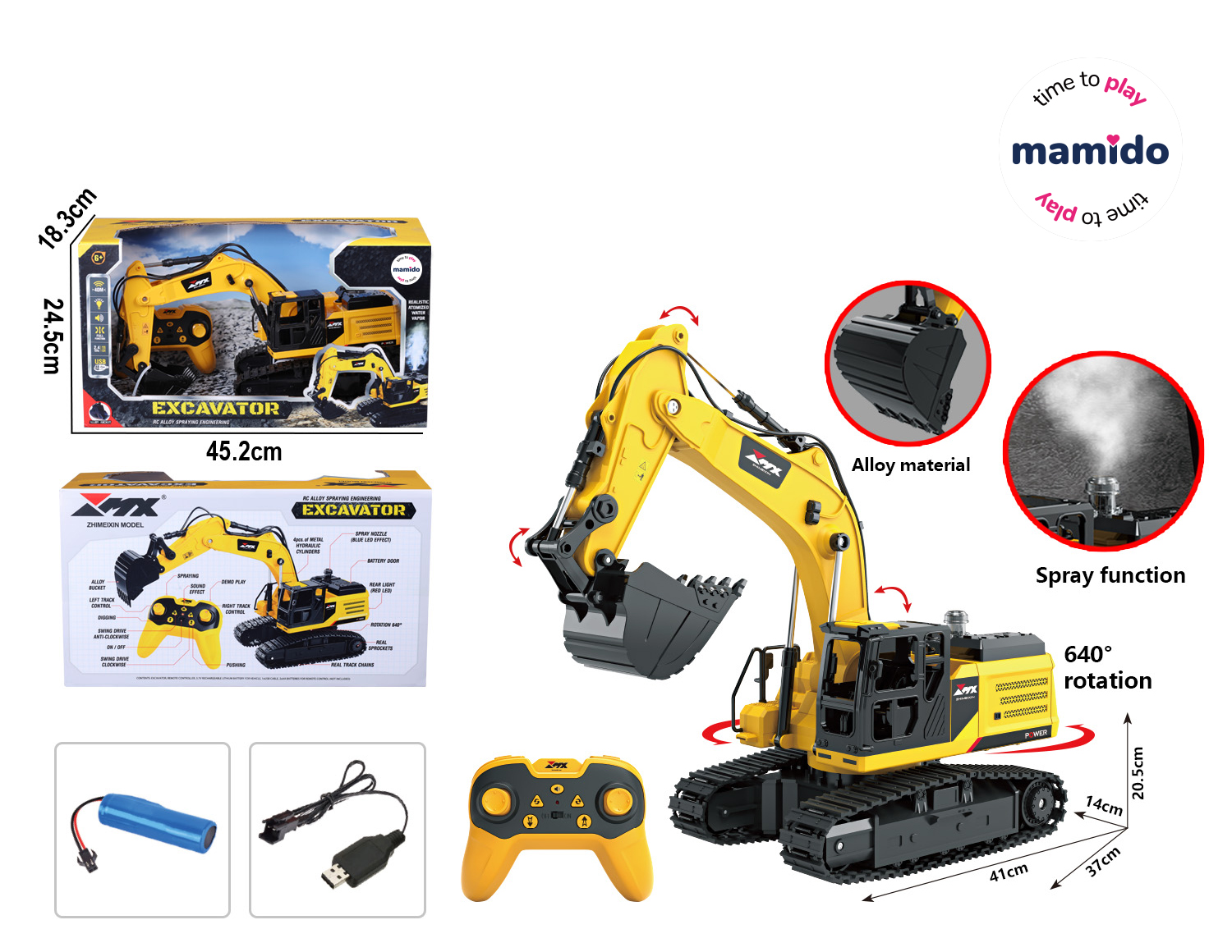 Rameno je možné plne ovládať, kabína sa otáča až o 640°, čo umožňuje autentické stavebné práce. Ovládanie zabezpečuje 2,4 GHz diaľkový ovládač s vysokou presnosťou a bez rušenia.