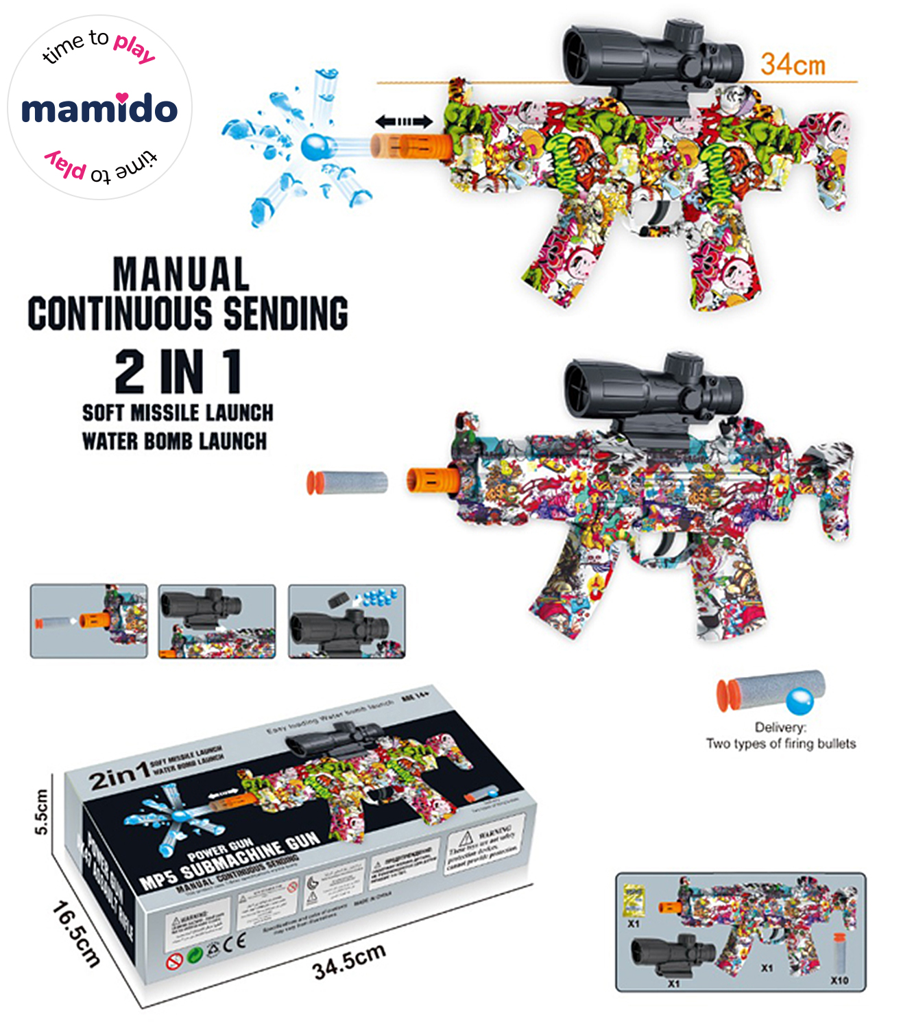 Manuálna detská puška 2v1 ponúka dva spôsoby streľby – pomocou mäkkých penových nábojov alebo vodných gélových guľôčok. Vďaka tomu je hra variabilná, napínavá a nikdy sa neomrzí.