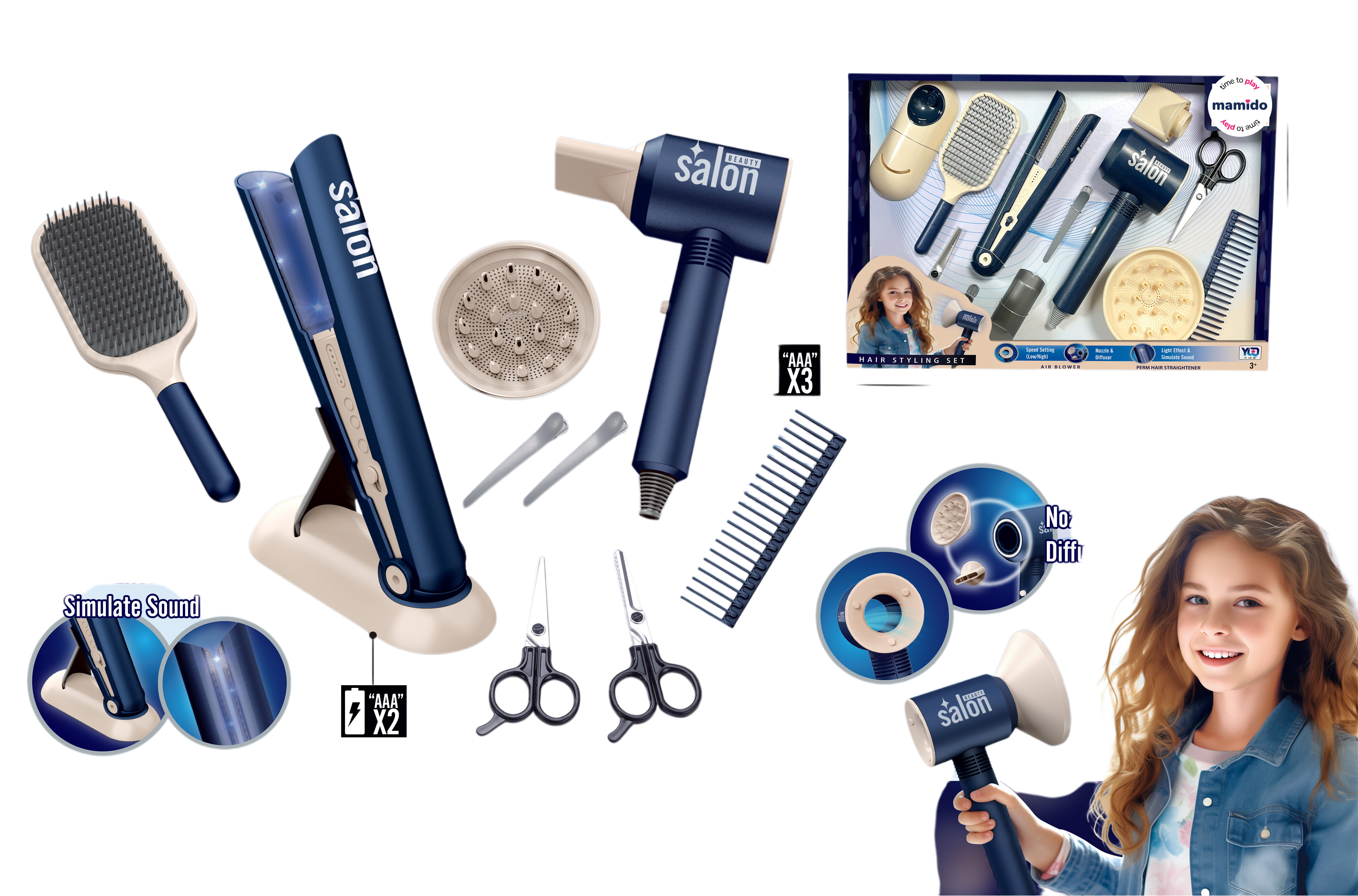 Veľká súprava pre malé kaderníčky. Súčasťou je fén, žehlička na vlasy, rôzne nadstavce, kefa, hrebeň, nožnice, sponky a ďalšie kadernícke doplnky. Deti si môžu vytvárať vlastné účesy, strihať, fénovať, rovnať – a hrať sa na skutočný salón. Štýlové farebné prevedenie a realistické tvary nástrojov zaručia skvelý zážitok. Hračka je vhodná pre deti od 3 rokov.
