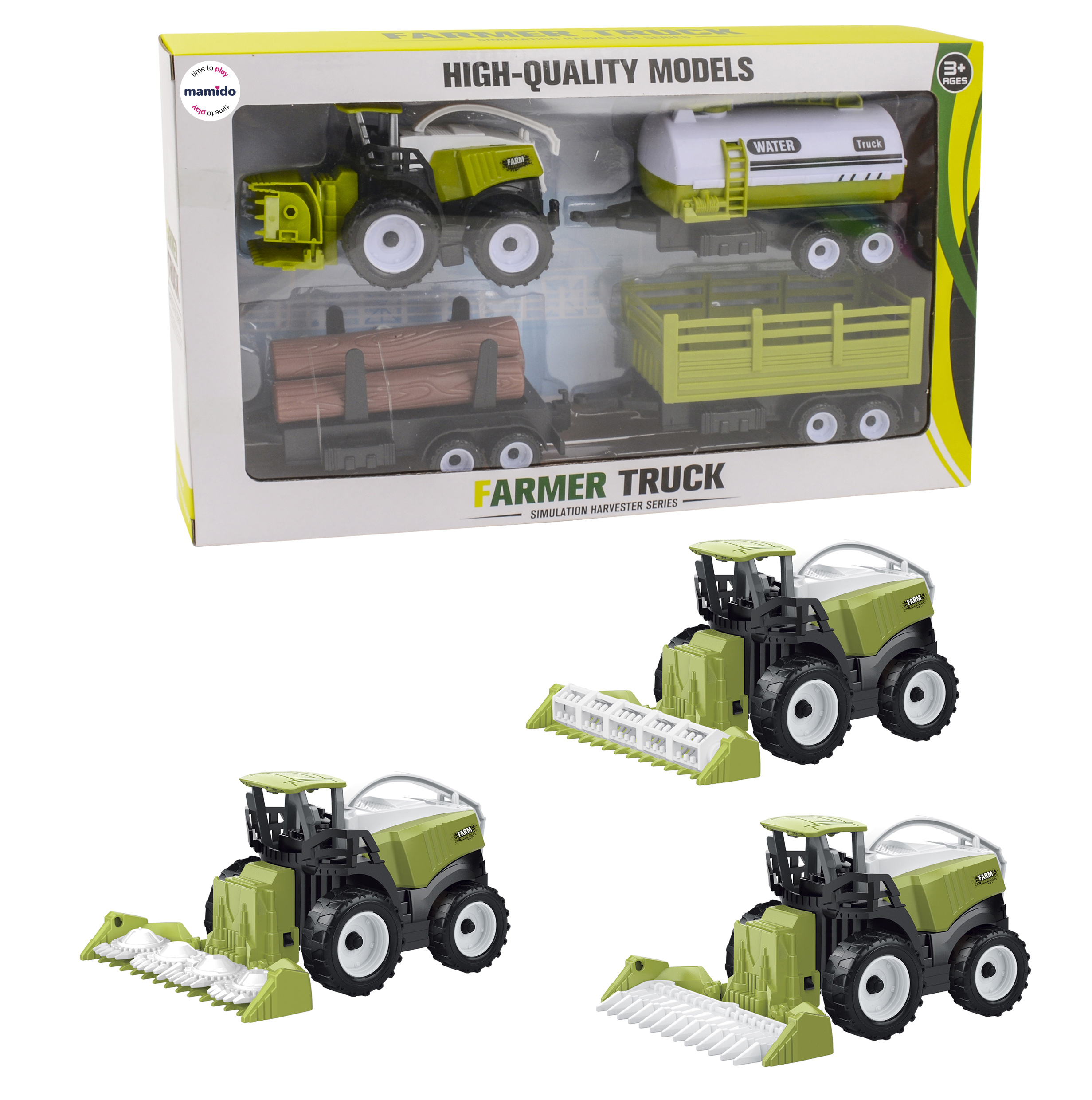 Realistická sada farmářských strojů potěší všechny malé milovníky zemědělské techniky. Hlavní součástí je kombajn se žací lištou, doplněný o tři různé vlečky – cisternu na vodu, přívěs na dřevo a nákladní farmářský vlek. Díky detailnímu provedení a robustnímu designu si děti mohou užít zábavu při hrách na farmáře.