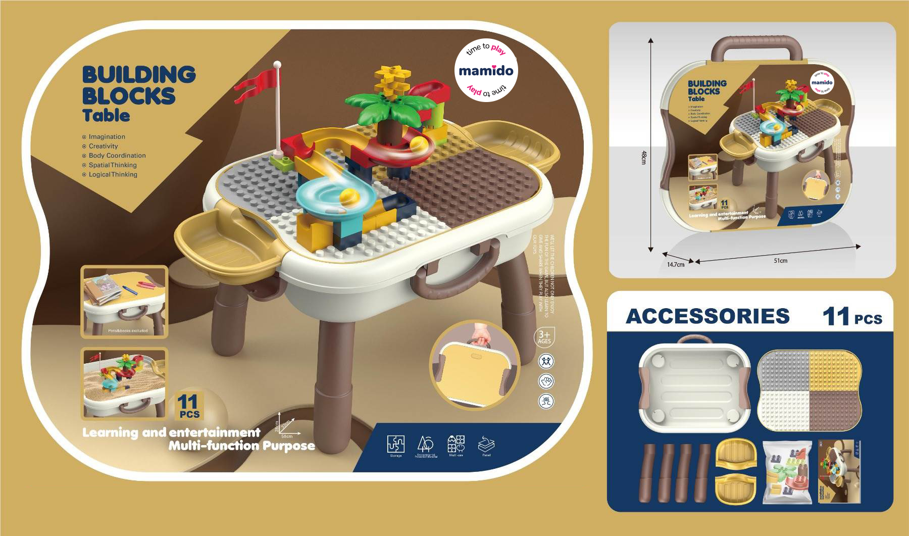 Súčasťou je súprava farebných kociek a dielikov, z ktorých deti môžu stavať dráhy pre guličky, veže alebo ďalšie kreatívne stavby. Stolček podporuje rozvoj fantázie, jemnej motoriky a logického myslenia.