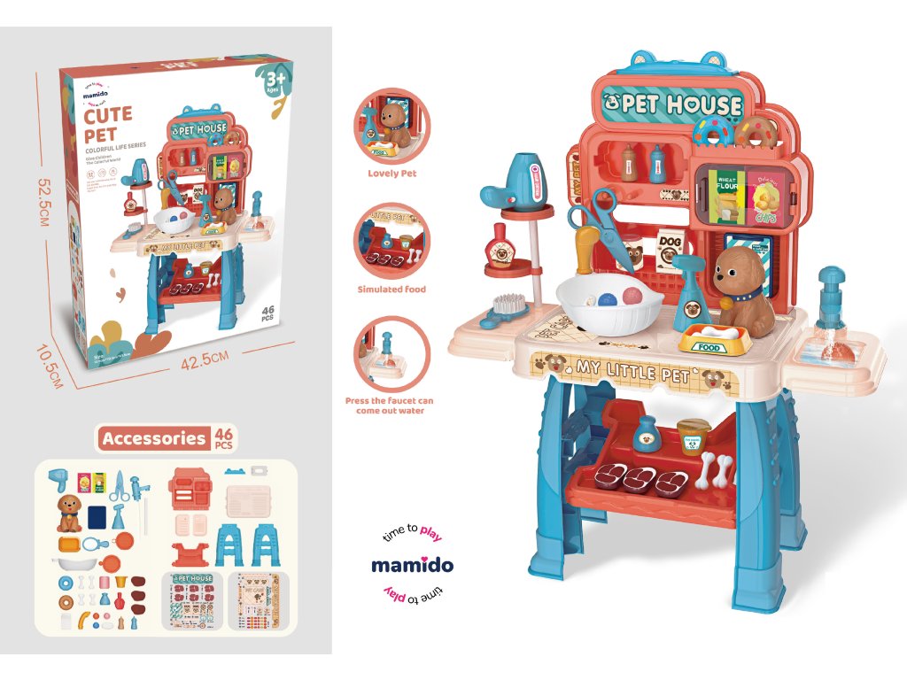 Rozkošná hracia súprava pre malých milovníkov zvieratiek, ktorá deťom umožní postarať sa o svojho vlastného psíka. Farebný stôl s doplnkami ponúka veľa možností na hranie – deti môžu psíkovi pripraviť kŕmenie, vykúpať ho, vysušiť fénom alebo vyčesať kefou. Nechýbajú ani doplnky ako nožnice, fľaštičky, misky alebo imitácia psích dobrôt.