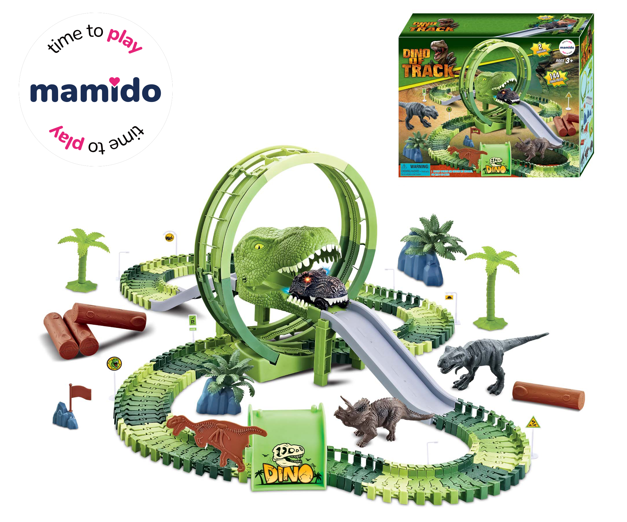 Adrenalínové dobrodružstvo v pravekej divočine! Závodná off-road dráha s veľkým loopingom a otváracou hlavou dinosaura prináša deťom nekonečnú akciu a kreatívne stavanie. Zostavia si vlastnú trať, umiestnia palmy, prekážky a potom už len sledujú, ako sa auto rúti cez čeľusť dravca. Dráha je flexibilná, variabilná a dá sa ľubovoľne prestavovať – rovinky, zákruty, rampy, výjazdy aj zjazd do papule dinosaura.