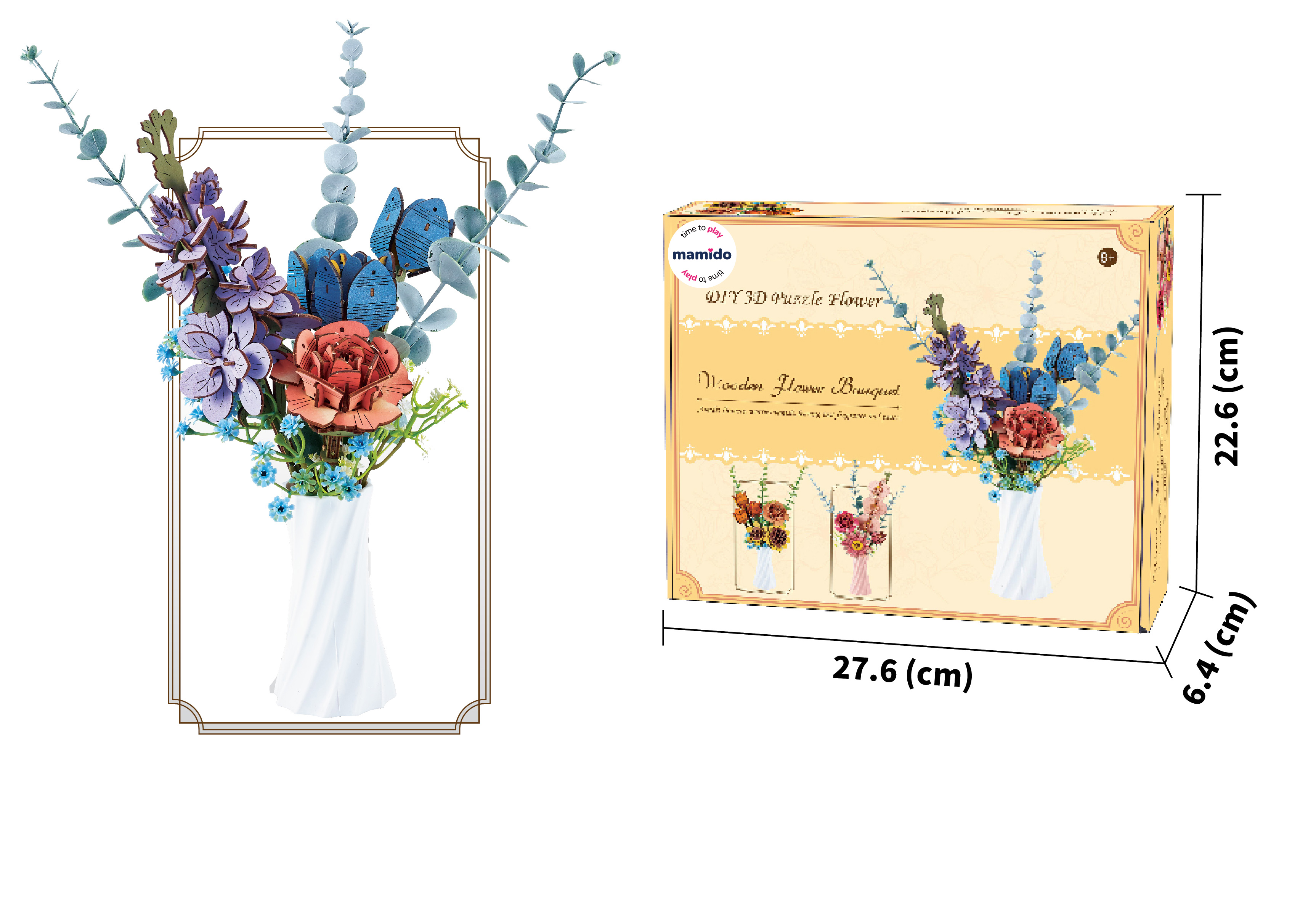Objavte čaro kreativity s drevenou 3D skladačkou kvetinovej kytice, ktorá premení jednotlivé dieliky na nádhernú dekoráciu. Po zostavení získate elegantnú kyticu s farebnými kvetmi a listami, doplnenú bielou vázou, ktorá ozdobí každý interiér. Kytica je nielen krásnym dizajnovým prvkom, ale aj skvelým darčekom pre všetkých milovníkov tvorenia a originálnych dekorácií.