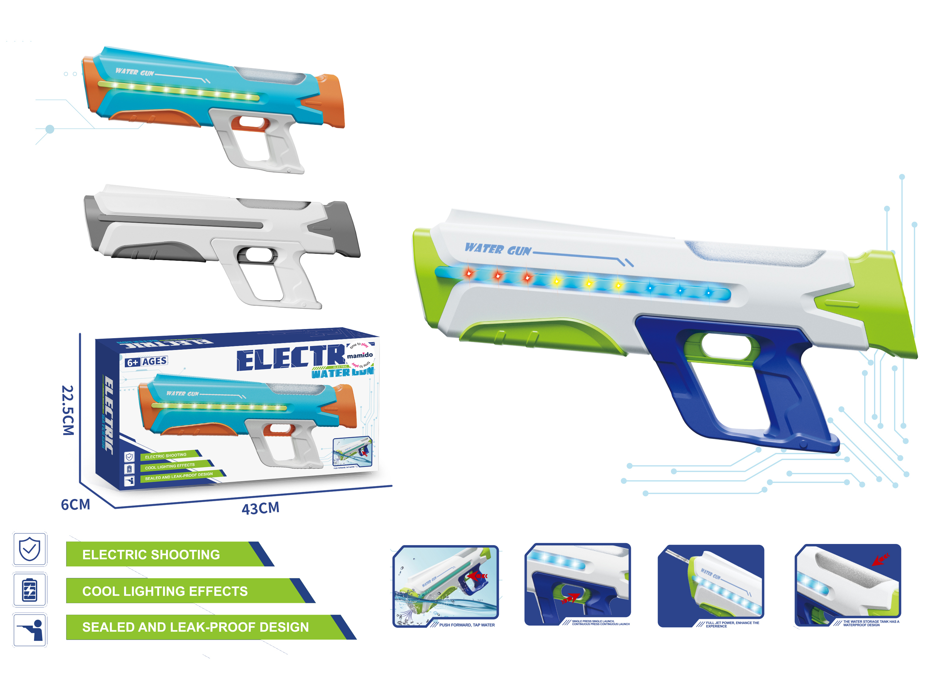 Pripravte sa na osviežujúcu letnú zábavu s elektrickou vodnou pištoľou! Vďaka automatickému striekaniu, farebnému LED osvetleniu a tesniacej konštrukcii proti úniku vody je táto pištoľ ideálnou voľbou pre všetkých malých aj veľkých bojovníkov. Ponúka silný prúd vody bez nutnosti ručného pumpovania, takže stačí stlačiť spúšť a akcia sa môže začať!