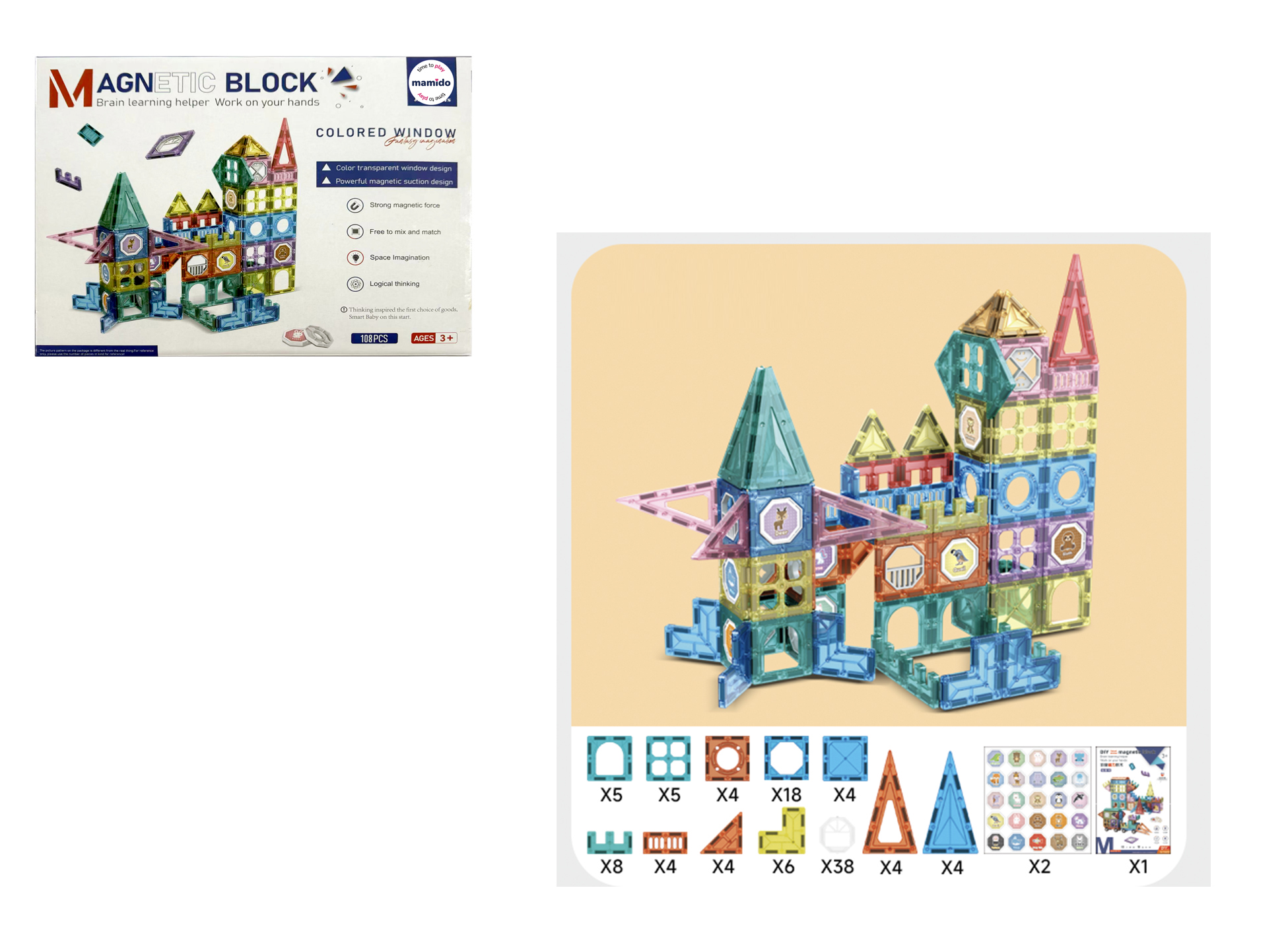 Stavebnica obsahuje 108 magnetických dielikov rôznych tvarov – trojuholníky, štvorce, oblúky, dlhé panely, dekoratívne okienka aj špeciálne diely. Transparentné prevedenie v žiarivých farbách podporuje vizuálne vnímanie a vďaka jednoduchému spájaniu si s ňou poradia aj menšie deti. Ideálne pre rozvoj kreativity, logického myslenia a priestorovej predstavivosti.
