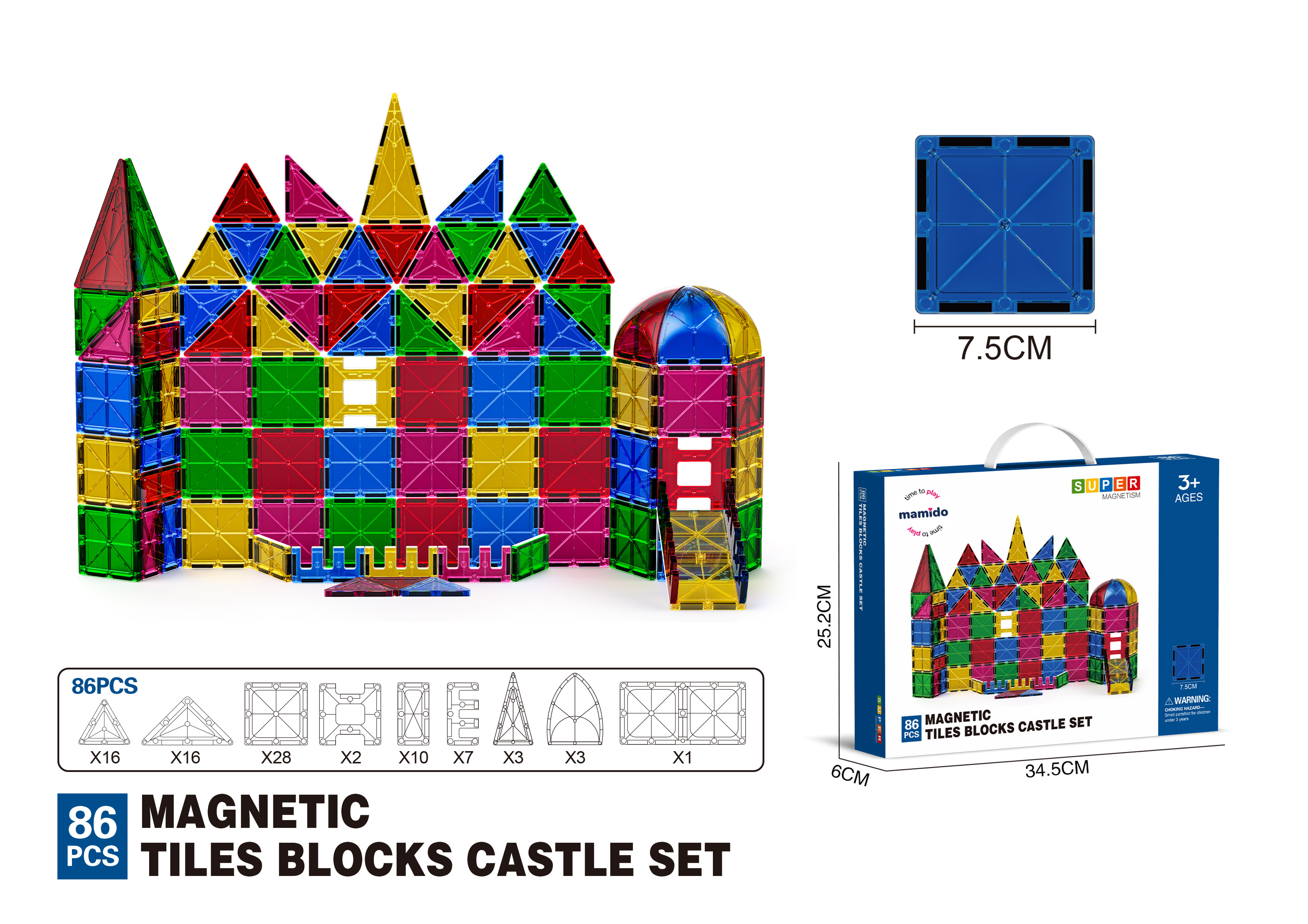 Súprava obsahuje 86 magnetických panelov v pestrých farbách, ktoré sa ľahko spájajú do rôznych tvarov. Priame tvary sú perfektné na vytváranie veľkých stien, podláh aj detailných konštrukcií. Stavebnica podporuje kreativitu, logické myslenie aj priestorovú predstavivosť.