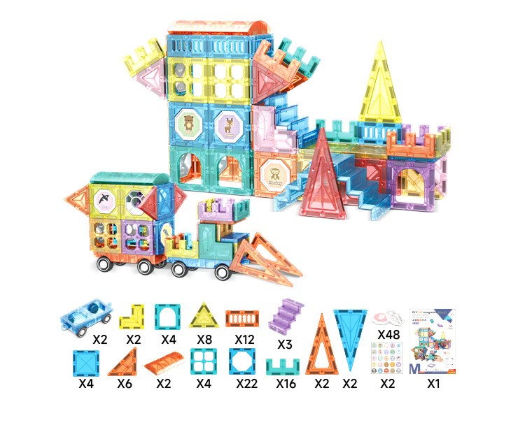 Stavebnica obsahuje 139 magnetických dielikov rôznych tvarov – trojuholníky, štvorce, oblúky, dlhé panely, dekoratívne okienka aj špeciálne diely. Transparentné prevedenie v žiarivých farbách podporuje vizuálne vnímanie a vďaka jednoduchému spájaniu si s ňou poradia aj menšie deti. Ideálne pre rozvoj kreativity, logického myslenia a priestorovej predstavivosti.