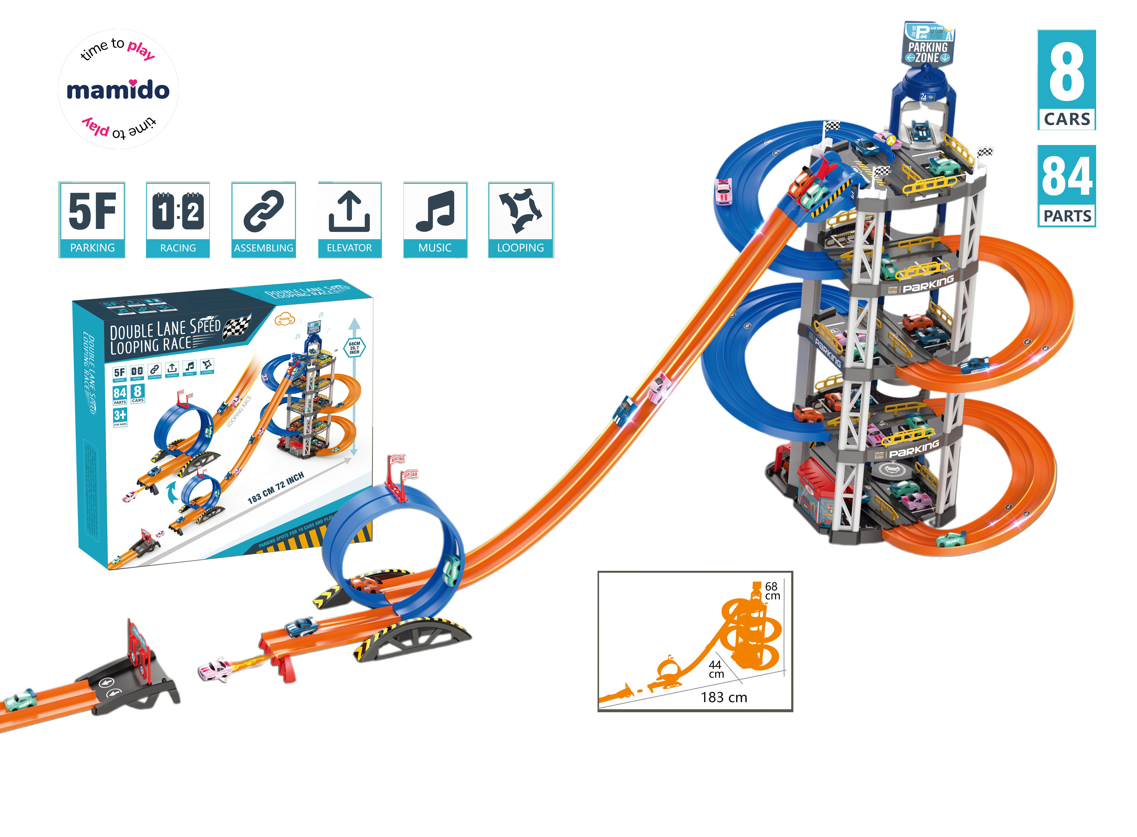 Super akčná závodná súprava pre malých milovníkov rýchlosti. Táto 5-poschodová závodná garáž s dvojitou závodnou dráhou ponúka napínavé jazdy v loopingoch, parkovanie na viacerých úrovniach, výťah pre autíčka a interaktívne zvukové efekty. Spolu 84 dielov a v balení 8 autíčok – ideálny set, ktorý zabaví dlho a stále je čo objavovať. Dráha má dĺžku až 183 cm a dosahuje výšku 68 cm.