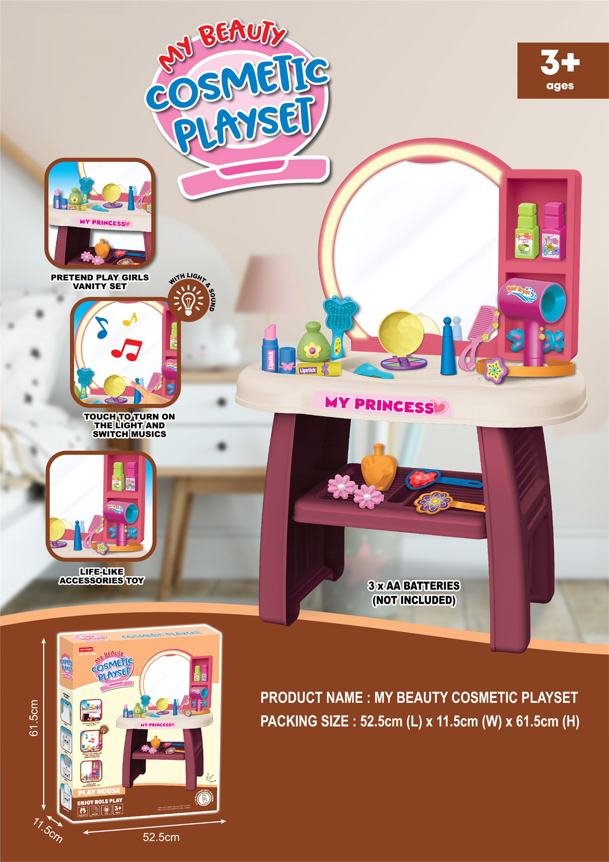 Veľké zrkadlo, úložné poličky a množstvo kozmetických doplnkov pre kreatívne a zábavné hranie. Po dotyku sa zrkadlo rozsvieti a prehrá melódiu, čo dodá hre ešte viac kúzla.