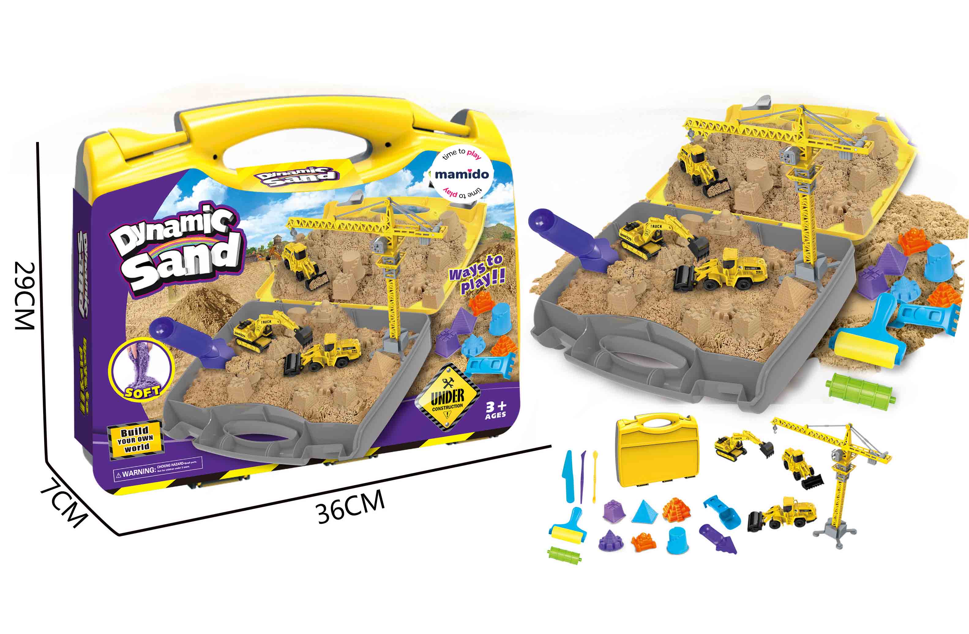 Súčasťou balenia je praktický kufrík, v ktorom nájdete stavebné stroje, žeriav, formičky, nástroje a kinetický piesok. Deti si môžu vytvoriť svoje vlastné stavenisko a hrať sa doma aj vonku.