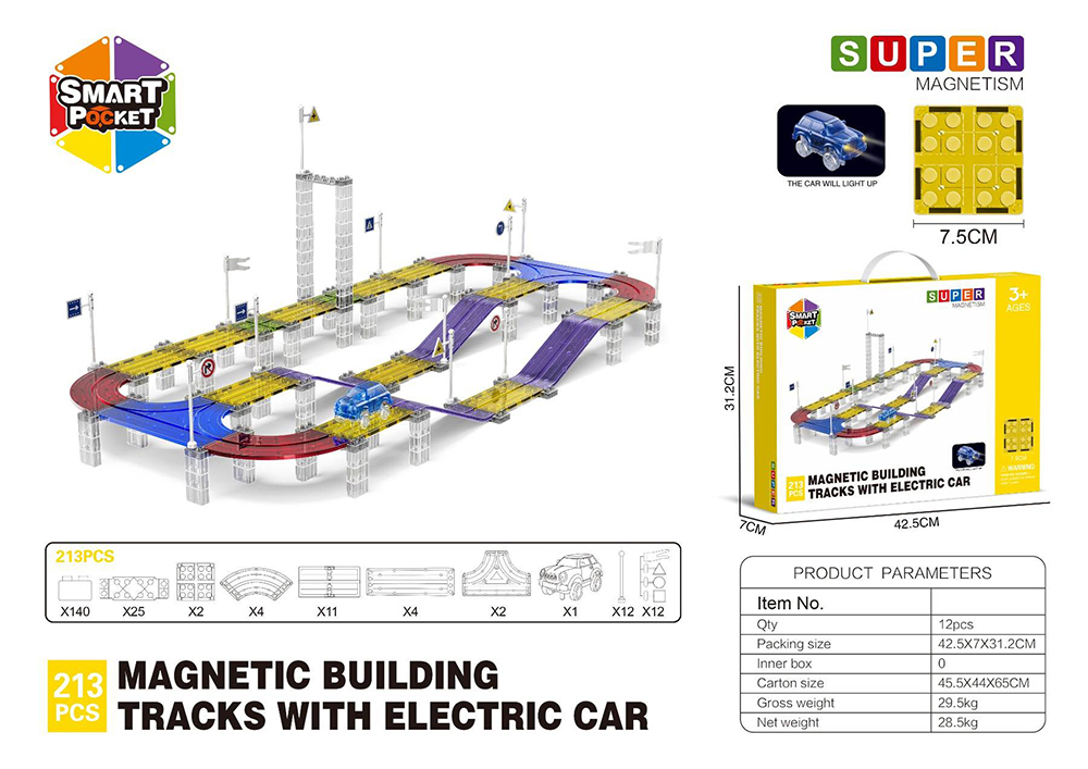 Súprava obsahuje 213 magnetických dielikov vrátane špeciálnych častí na tvorbu dráhy. Vďaka silným magnetom sa panely jednoducho spájajú, takže deti môžu experimentovať s tvarmi aj výškami tratí. Elektrické autíčko samo prechádza celú trasu, čo prináša skvelý zážitok z pohybu a rozvíja technické uvažovanie.