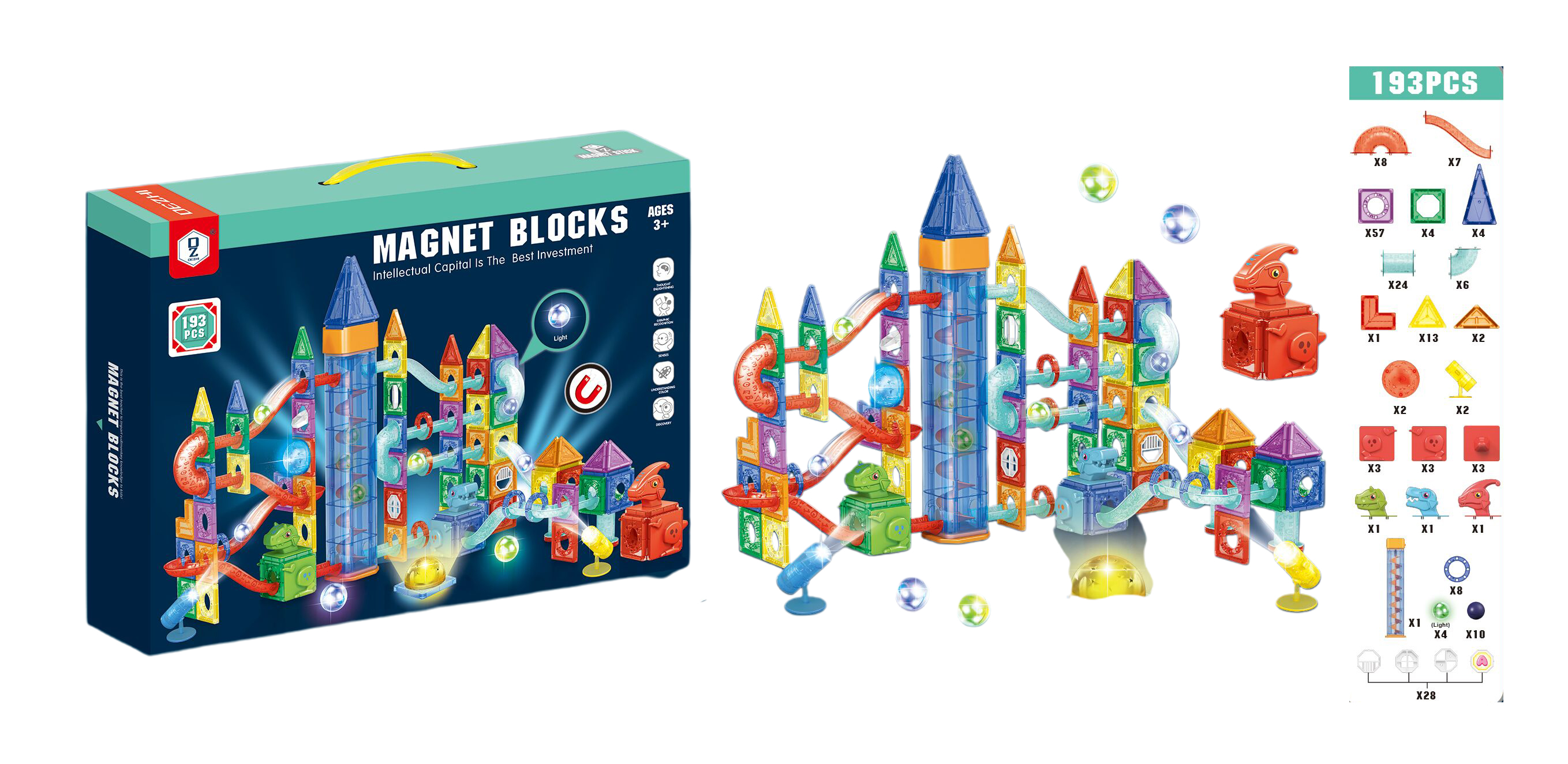 - Obsah balenia: magnetické bloky, priehľadné dráhy, guľaté loptičky, špeciálne doplnky (vrátane svetelného prvku)
