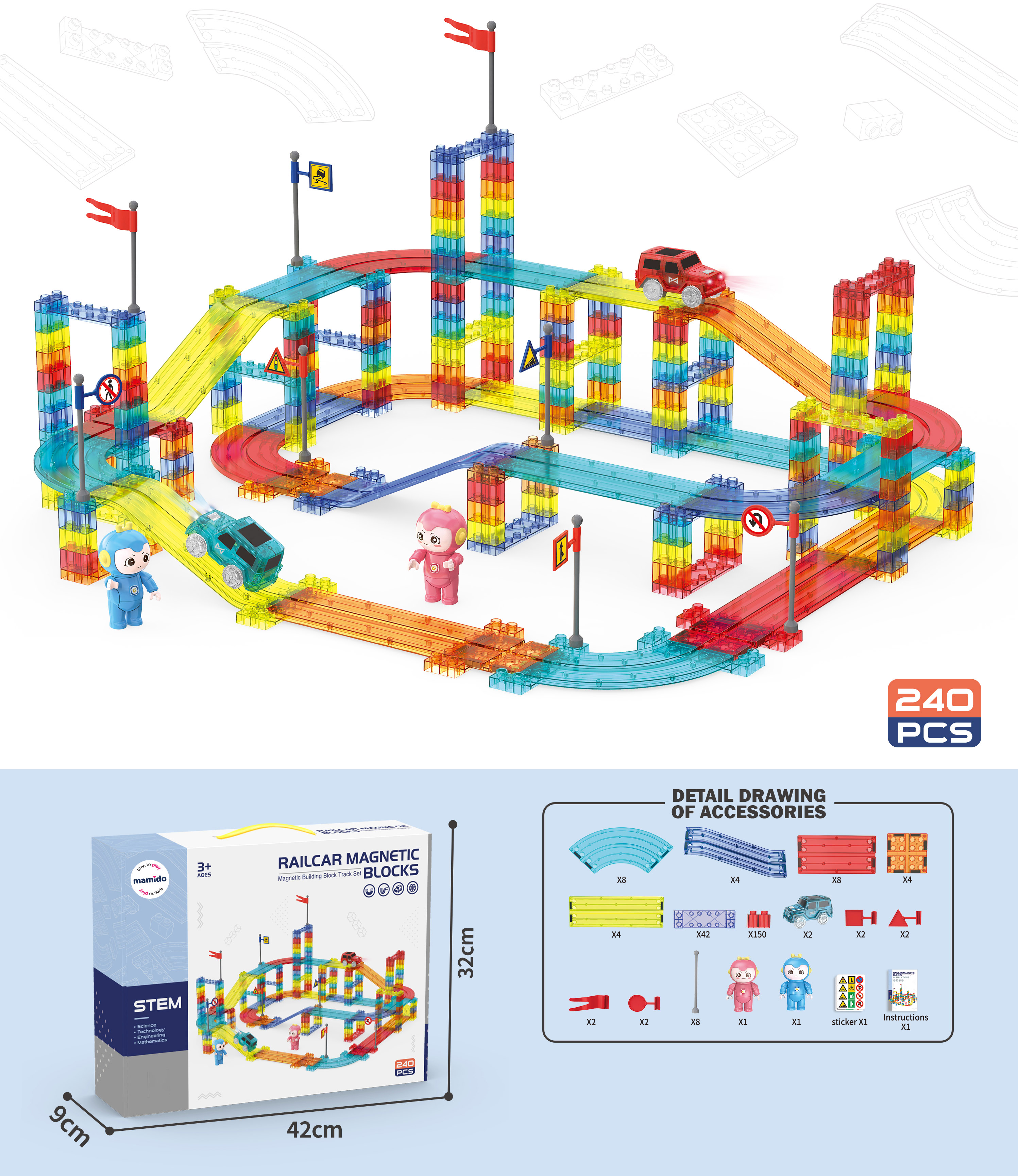 Vytvorte vlastné farebné mesto plné mostov, veží a pretekárskych dráh s touto magnetickou stavebnicou o 240 dieloch. Vďaka jednoduchému spájaniu pomocou magnetov je možné ľahko zostaviť rôzne stavby, koľaje aj rampy, po ktorých môžu jazdiť autíčka.
