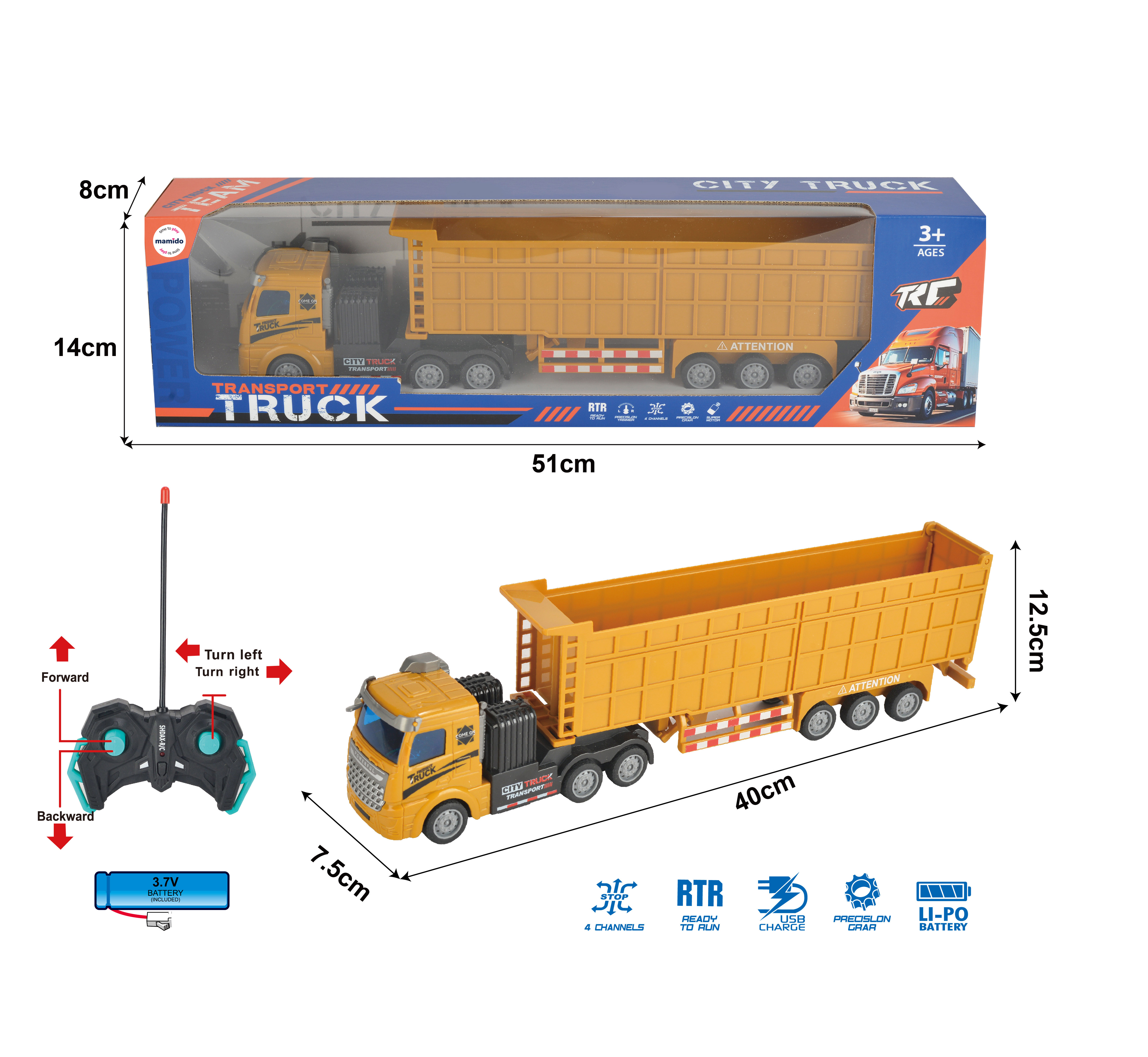 Ovládačom sa dá pohodlne jazdiť dopredu, dozadu a zatáčať do strán. Vďaka dĺžke 40 cm pôsobí kamión naozaj robustne a verne pripomína skutočné vozidlo.