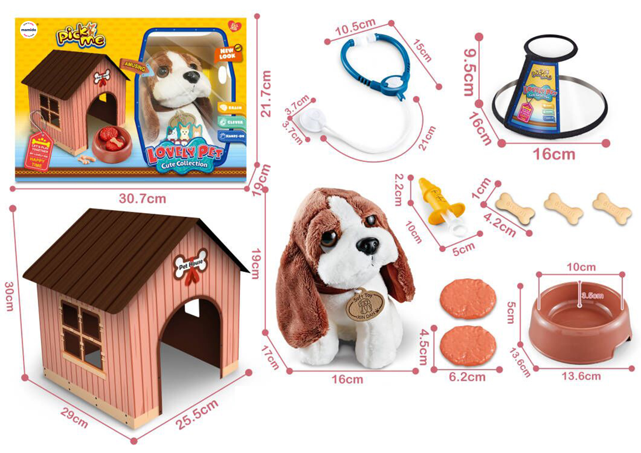 V súprave nechýbajú misky, kocky, jedlo, injekcia a stetoskop, vďaka ktorým sa deti naučia starať o zvieratko, kŕmiť ho a kontrolovať jeho zdravie. Domček sa ľahko skladá a slúži ako útulné miesto pre psíka.